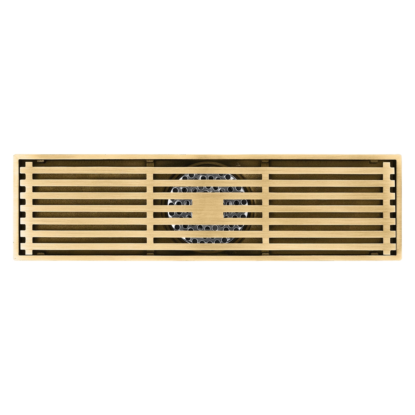 12-Inch Brushed Gold Rectangular Floor Drain - Square Hole Pattern Cover Grate - Removable - Includes Accessories