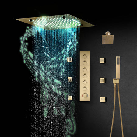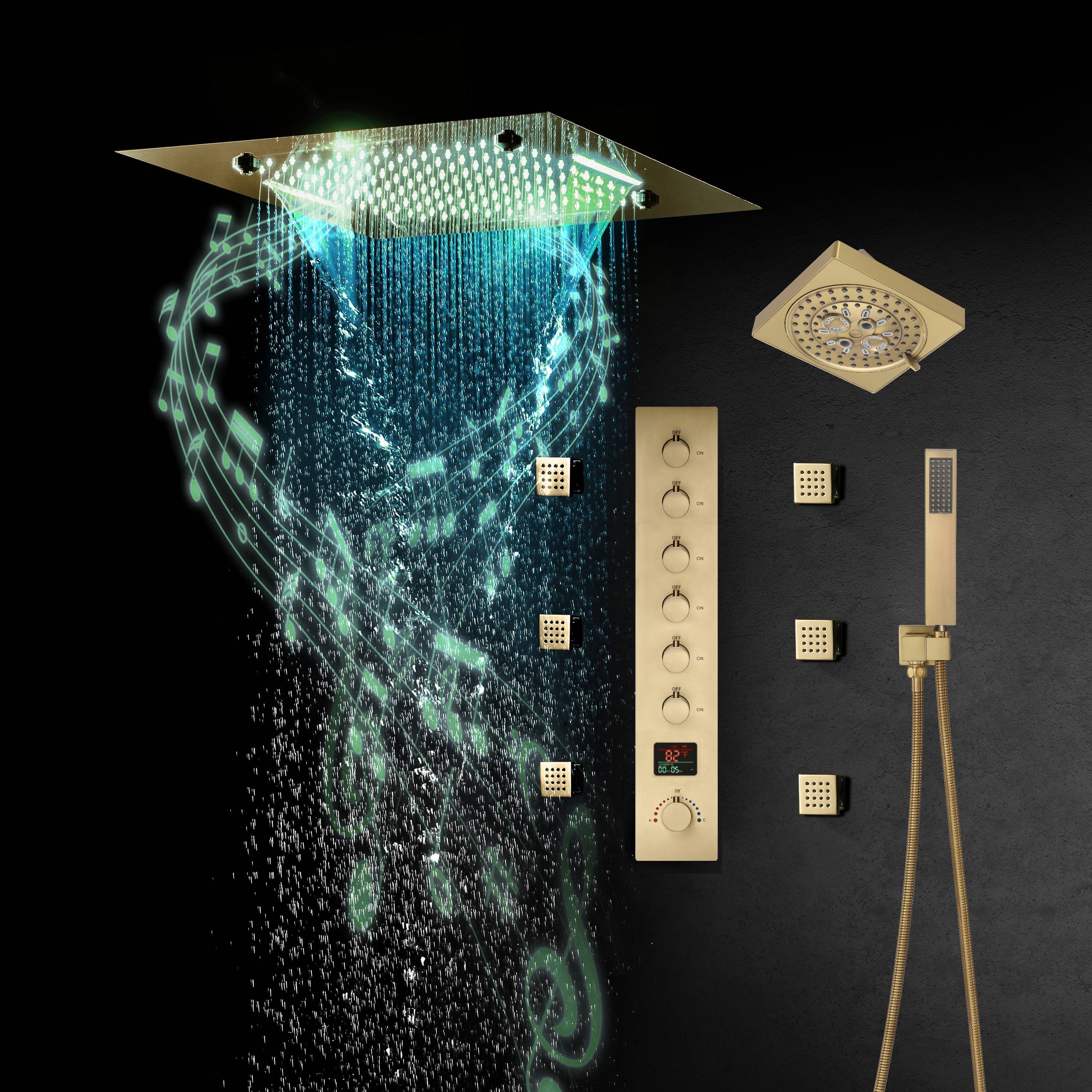 Flush-Mounted Brushed Gold 6-Way Digital Thermostatic Shower System: Six Body Jets, Regular Head, and 20-Inch Rainfall Waterfall Mist Shower Head Featuring Bluetooth Music and 64-Color LED Lights