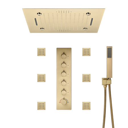Brushed Gold 5-Way Thermostatic Shower System with 20-Inch LED Rainfall, Waterfall, and Mist Functions, Bluetooth Music, 6 Body Jets, and Touch Panel Control, Flush-Mounted Design