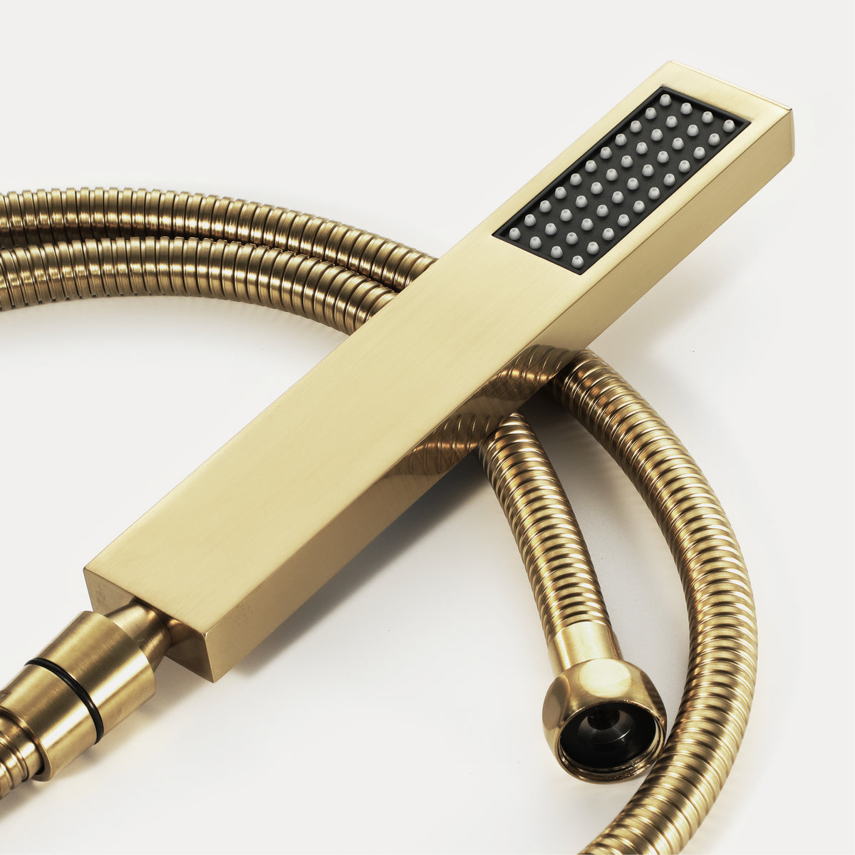 Immerse yourself in a luxurious shower experience with our 5-function thermostatic shower system. Finished in a sophisticated brushed gold, it features a rainfall, waterfall, and mist showerhead, body spray, and handheld sprayer, all controlled by a 5-way thermostatic valve.