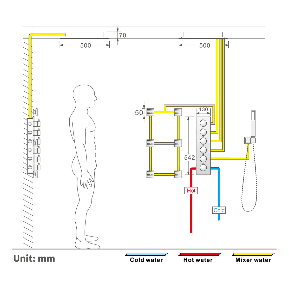 Water Pipe Lines:ย The system requires 3/4" hot and cold water pipes for the mixer inlet, while the other connections are 1/2".