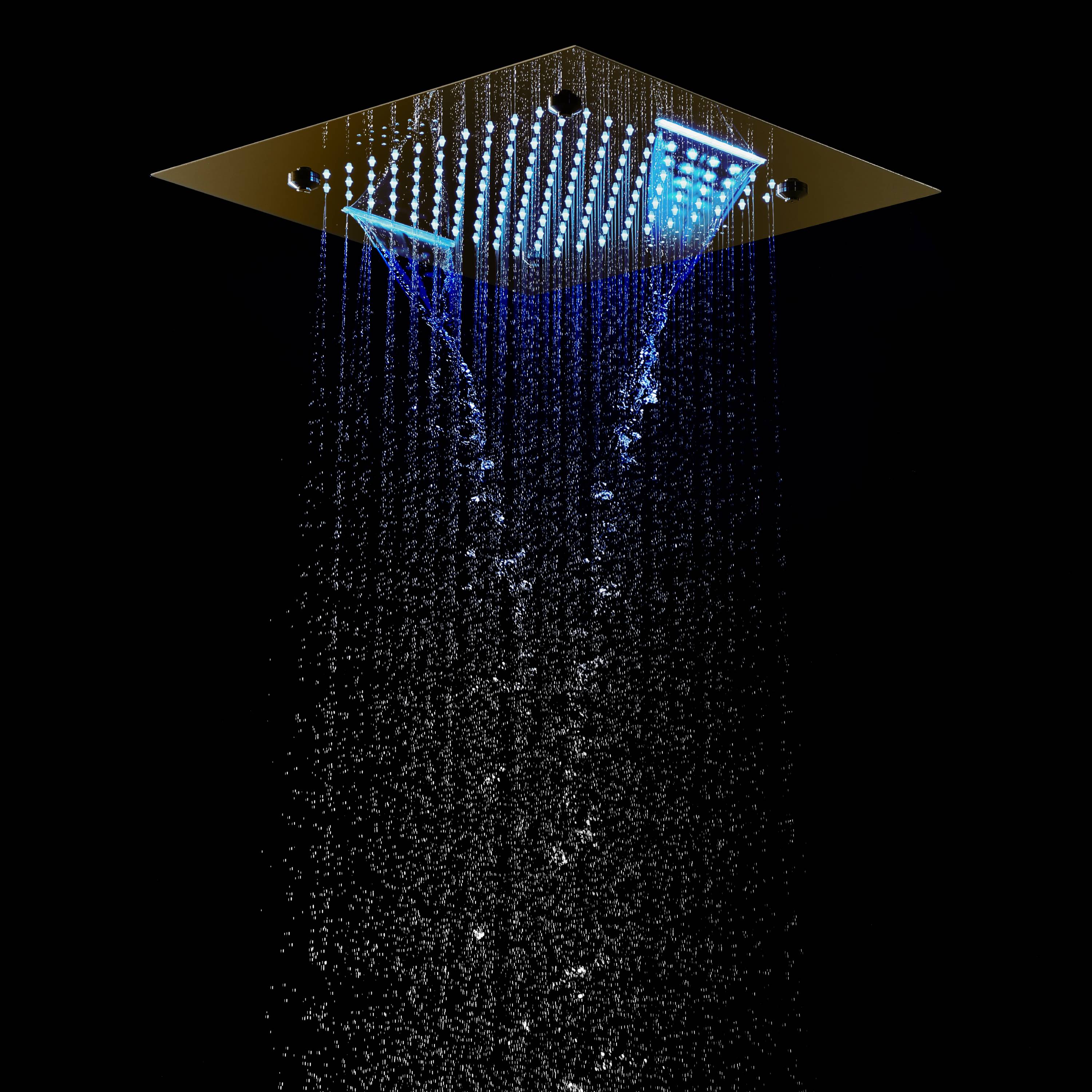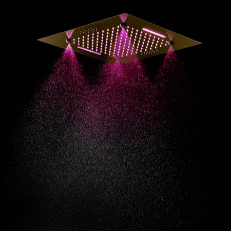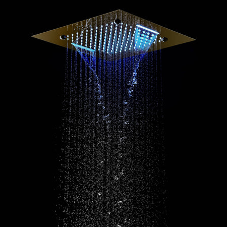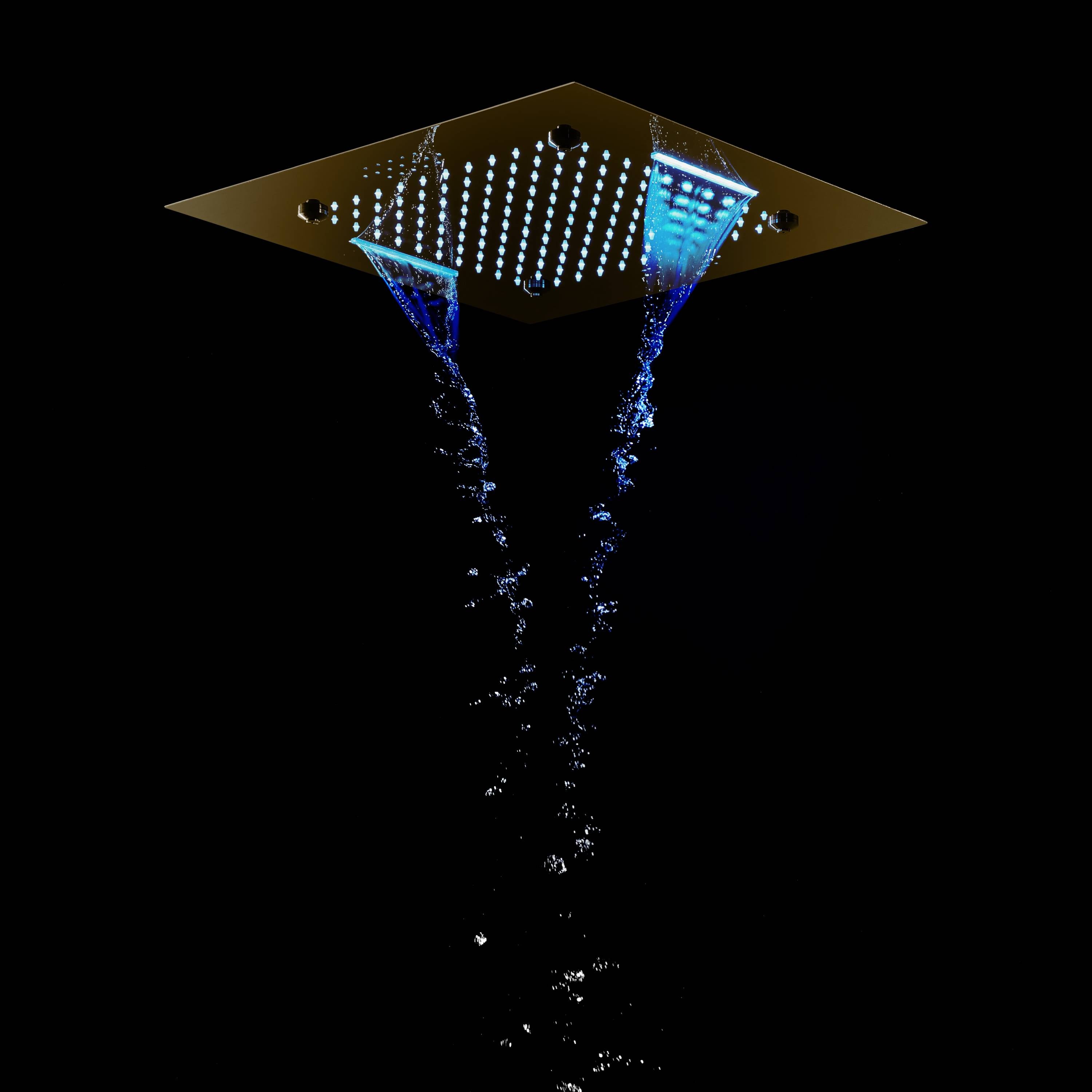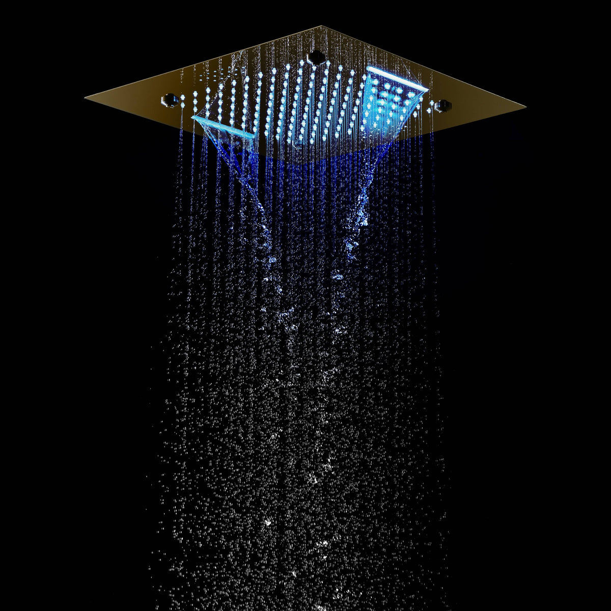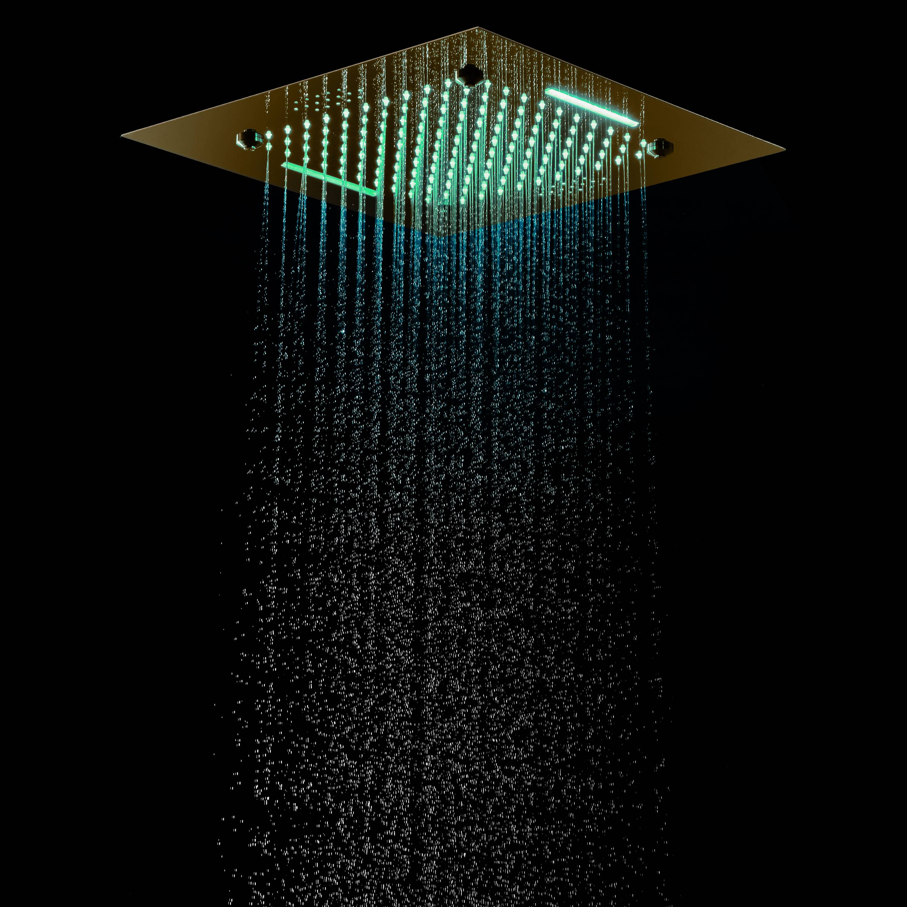 LED Rainfall, Waterfall, and Mist Shower Head:ย The flush-mounted 20" x 20" shower head features rainfall, waterfall, and mist functions, 64 LED lights, and Bluetooth music. The LED lights are controlled via a touch panel, and the music can be controlled from your cell phone, which you can turn on or off during the shower.