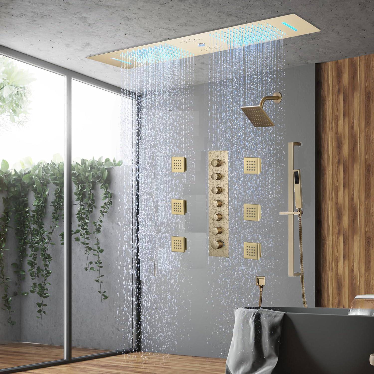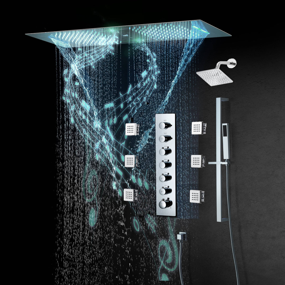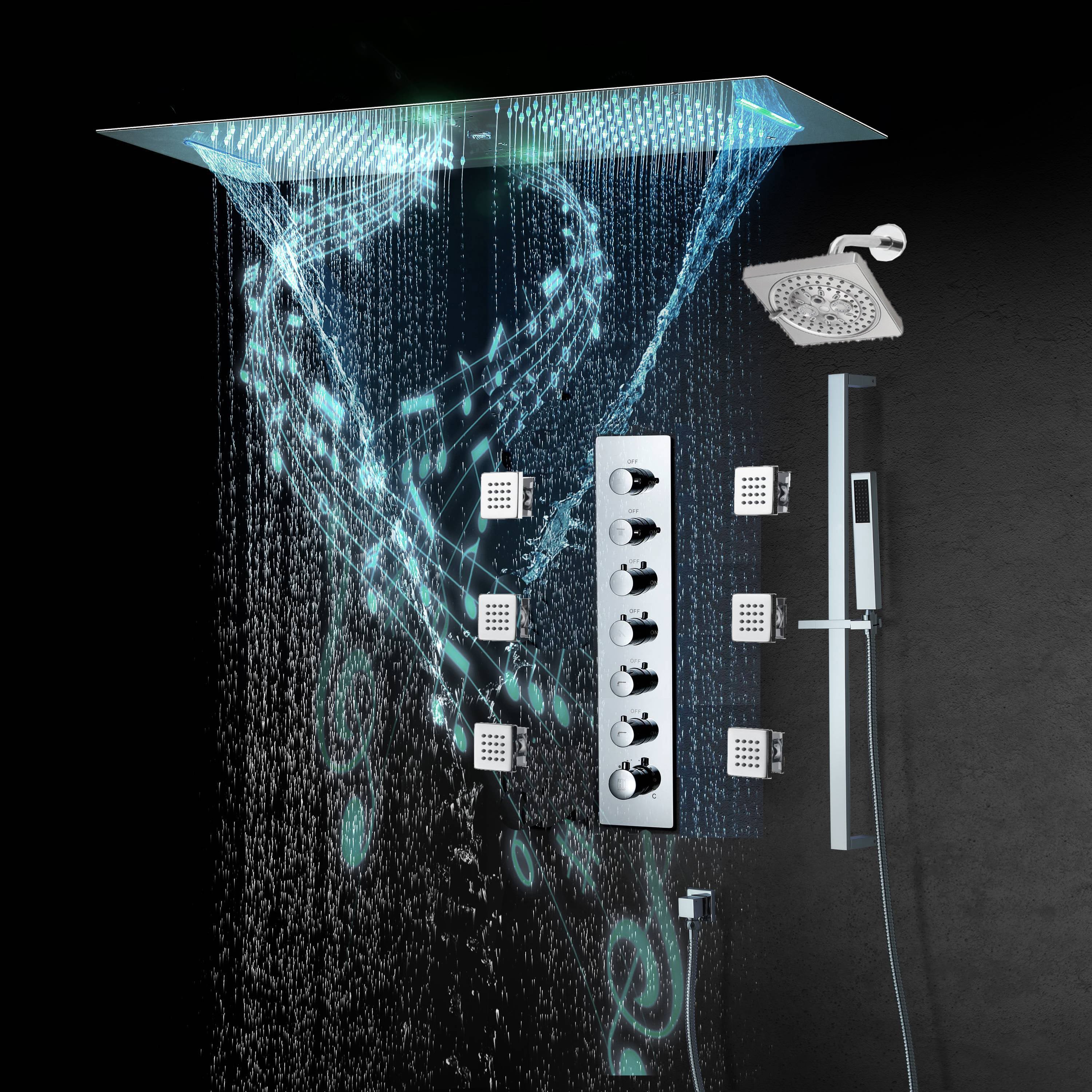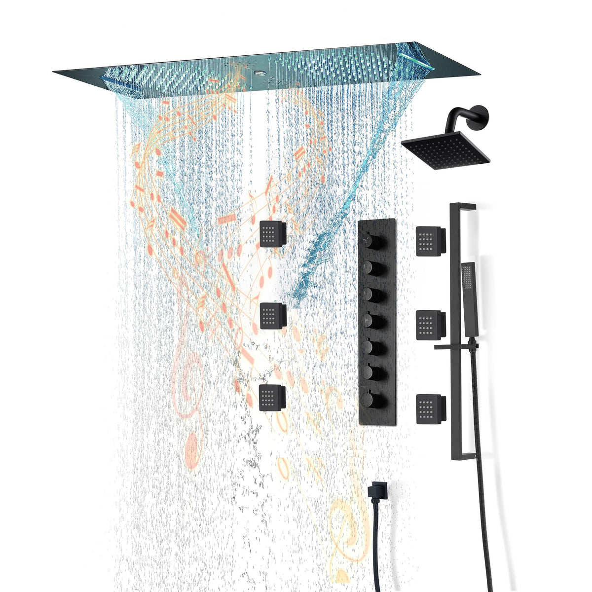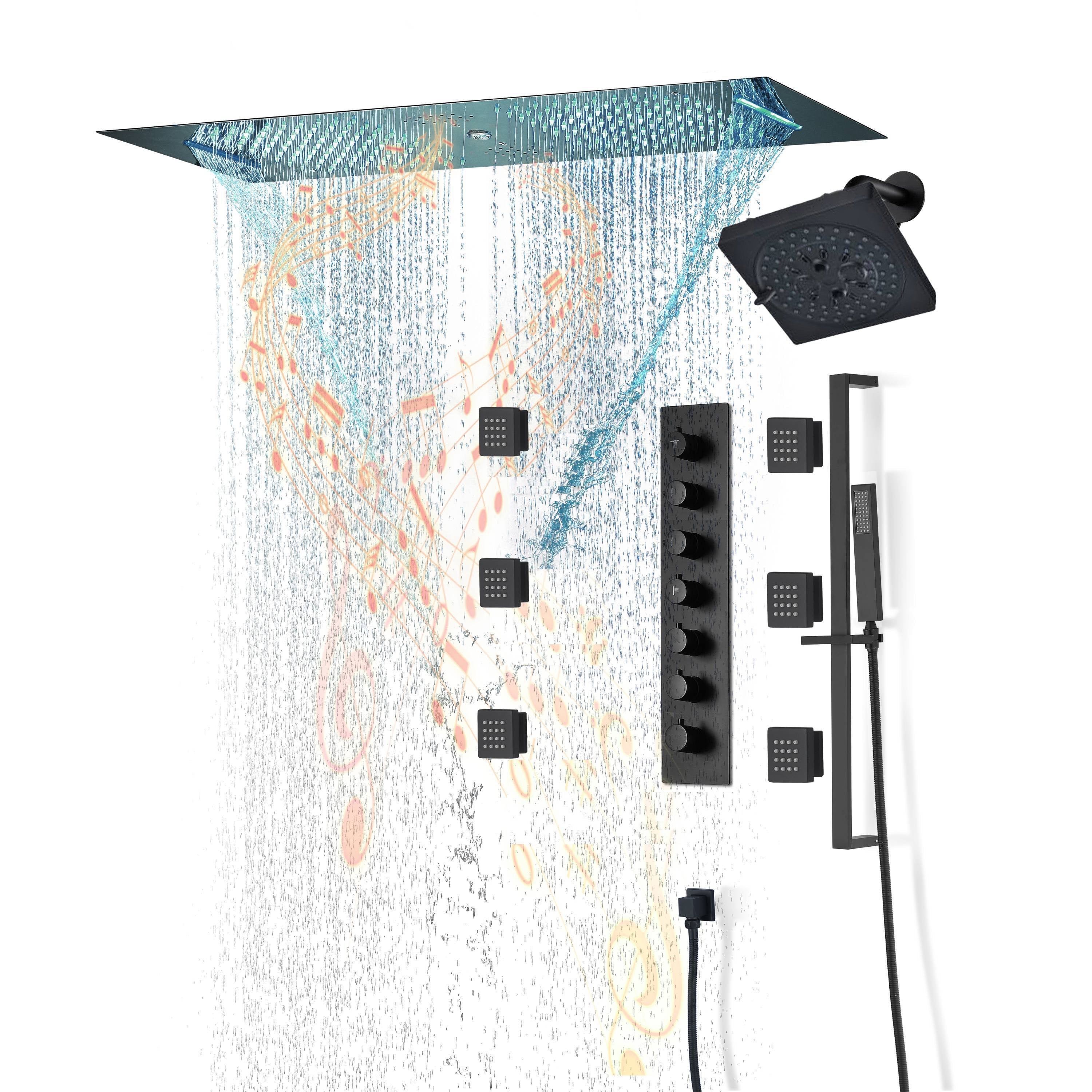 Chrome or matte black or brushed gold or brsuehd nickel 35" Bluetooth Music LED Shower System with Waterfall, 6-Way Thermostatic Valve, Regular Head, 6 Body Jets