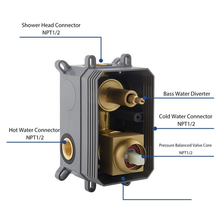 Pressure Balance Rough-In Valve: The system includes a two-way pressure balance rough-in valve with trim. This feature helps prevent sudden temperature changes, providing a safe, anti-scald shower experience.