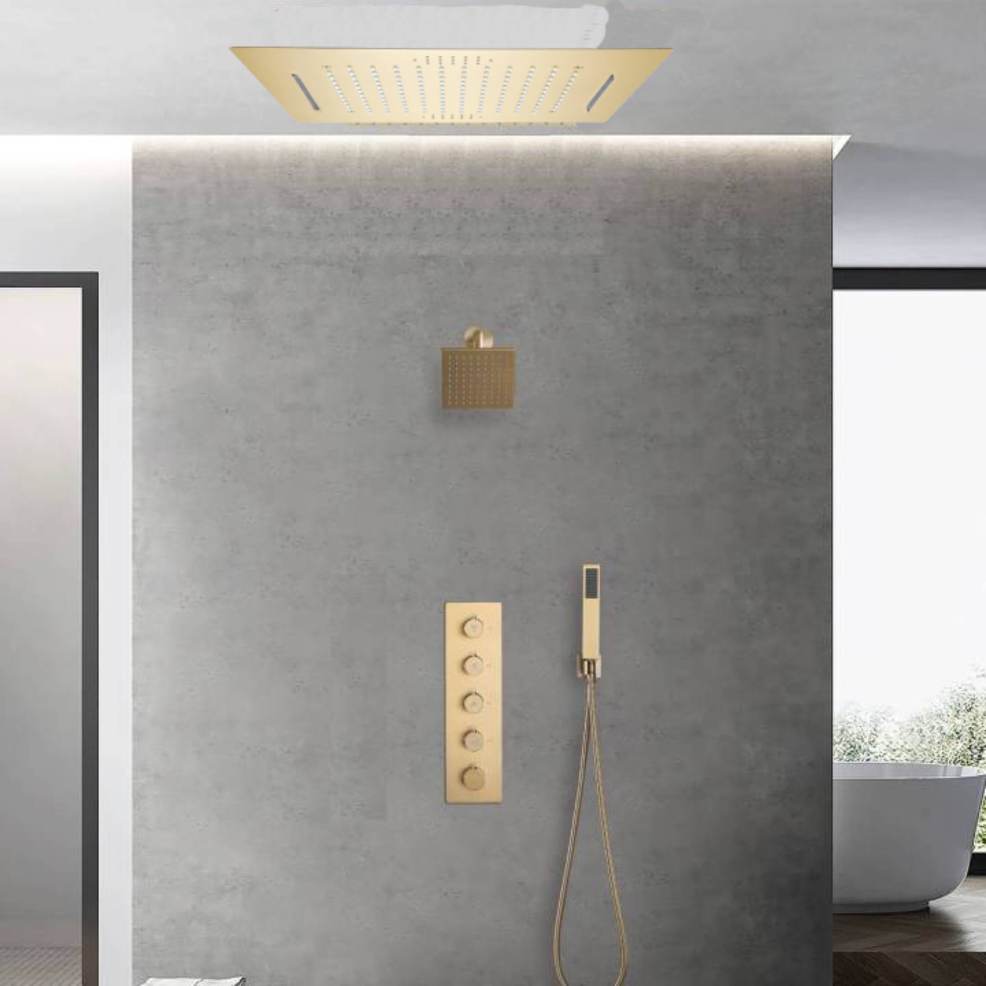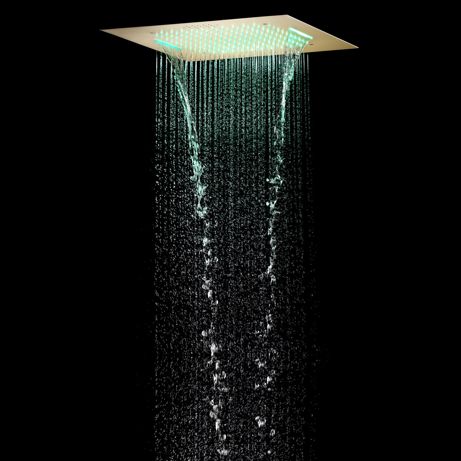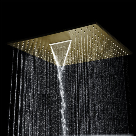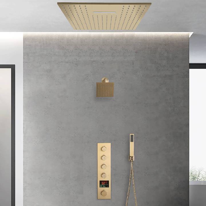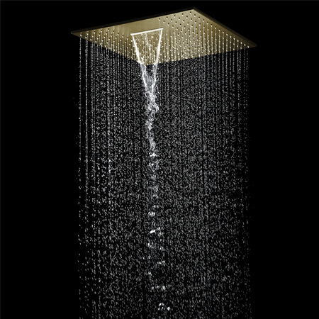 Brushed Gold 20-Inch Or 24-Inch Rainfall Waterfall Ceiling Mount Shower Head with 4-Way Thermostatic Faucet, High-Pressure Wall Mount Head