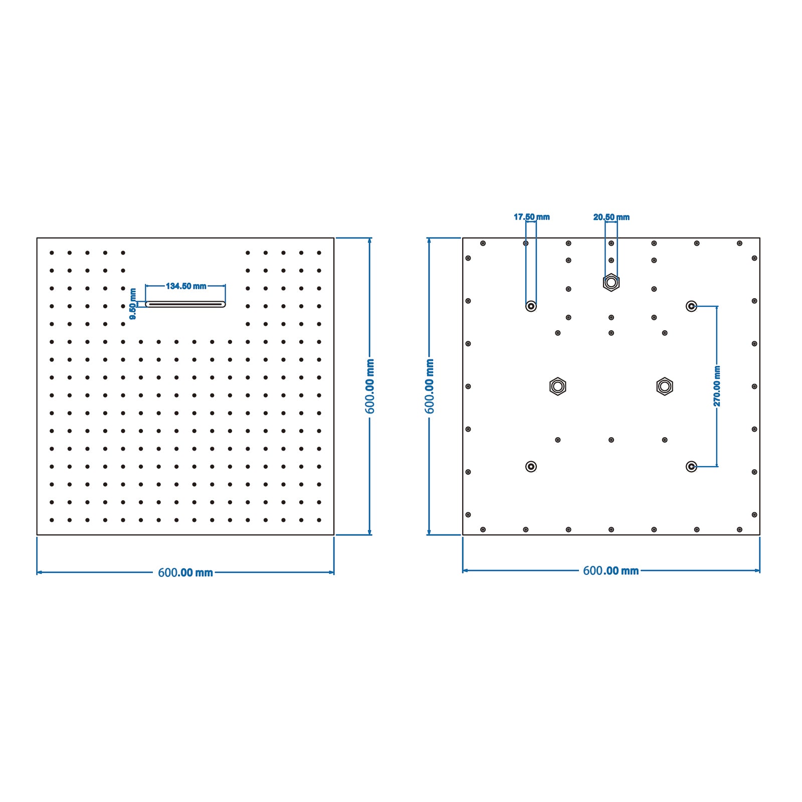 The Rainfall waterfall SHOWER HEAD 20" is a fixed rain showerhead with a size of 20x20 inches, made of brass and stainless steel in Brushed nickel color and it is compatible with G1/2" standards for connection. Additionally, the ceiling mounted ARM 9" is a ceiling-mounted shower arm made of brass in brushed nickel color, with an adjustable length and a straight flange. It has a male connection of 1/2 NPT standards.