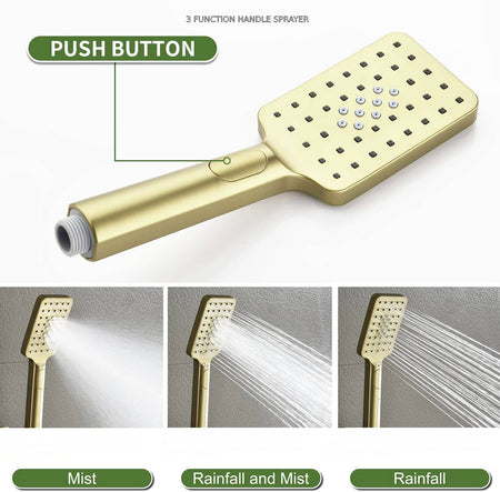 Included in this set are two shower heads, providing ultimate convenience and versatility. The regular head features a 6x6 inch size, with a swivel function for adjustable positioning. Crafted from high-quality brass material, it ensures lead-free and high water pressure performance.