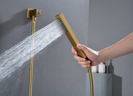 The shower system boasts a stunning brushed gold surface treatment. The handheld shower and shower holder are made from lead-free brass, guaranteeing high water pressure and durability. The 59-inch flexible shower hose is made from stainless steel.