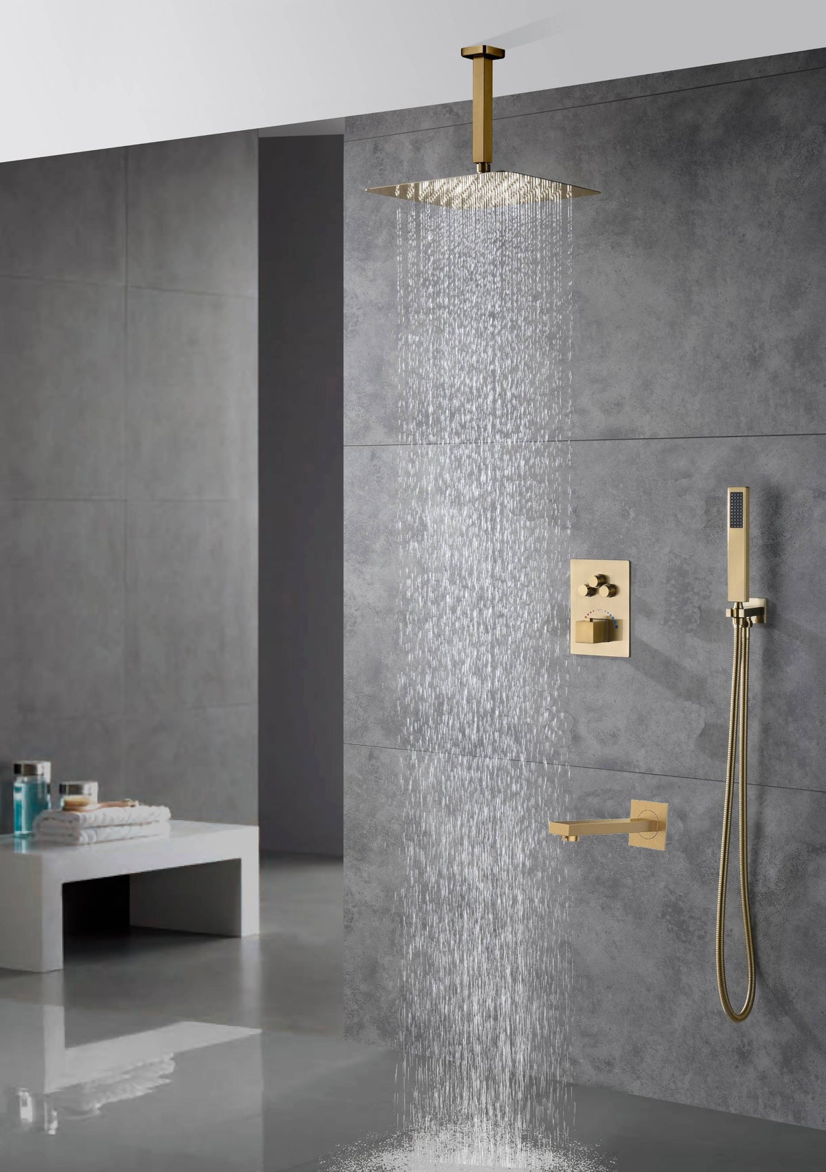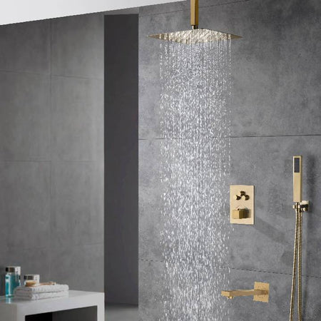 Ceiling-Mounted Brushed Gold Thermostatic Shower System with Tub Spout and Choice of 12 or 16 Inch Rainfall Head: Simultaneous or Separate Functionality