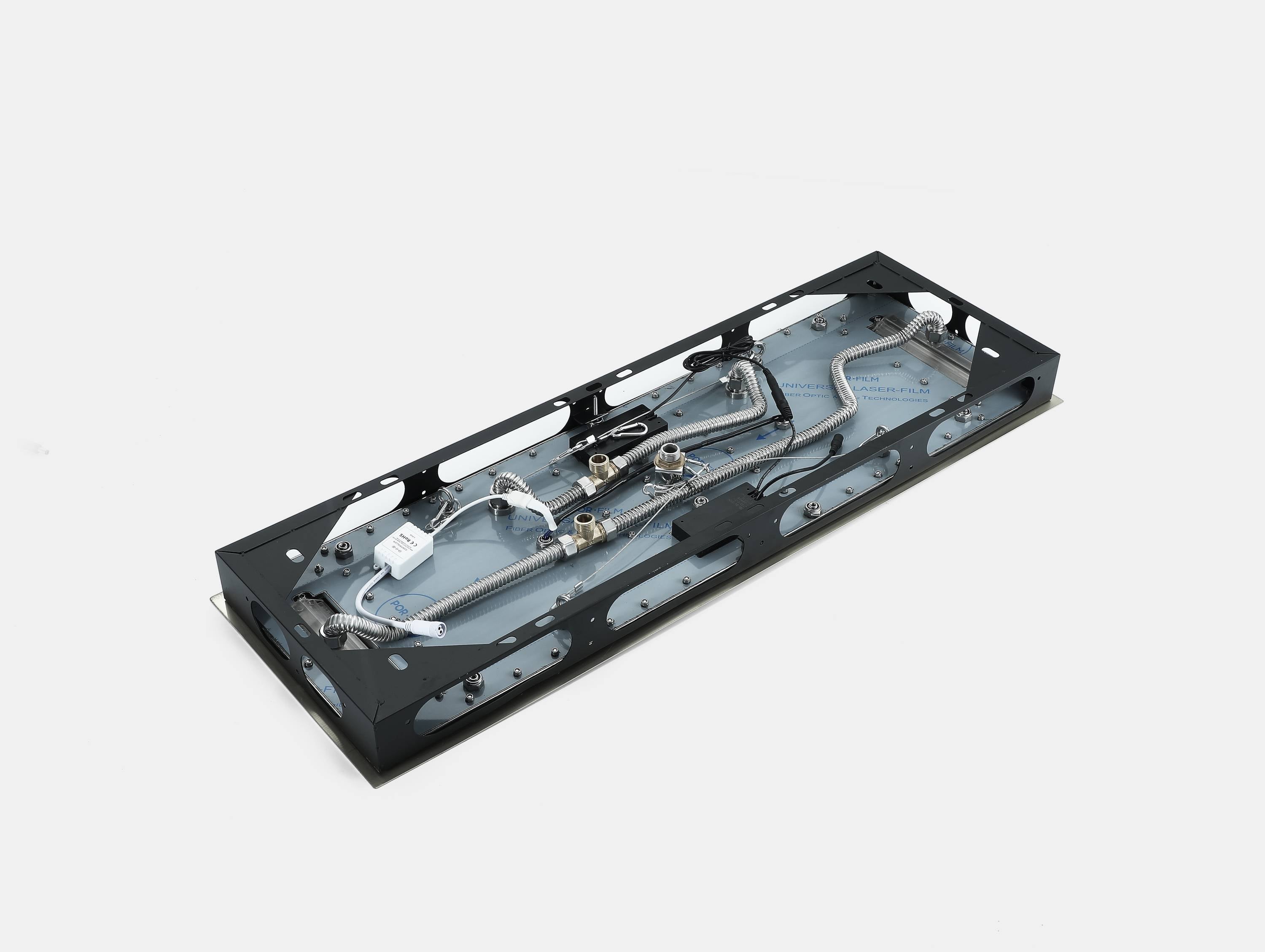 The system includes a touch panel that controls a 64-color LED light system. The LED lights are powered by a waterproof transformer, ensuring safety and durability.