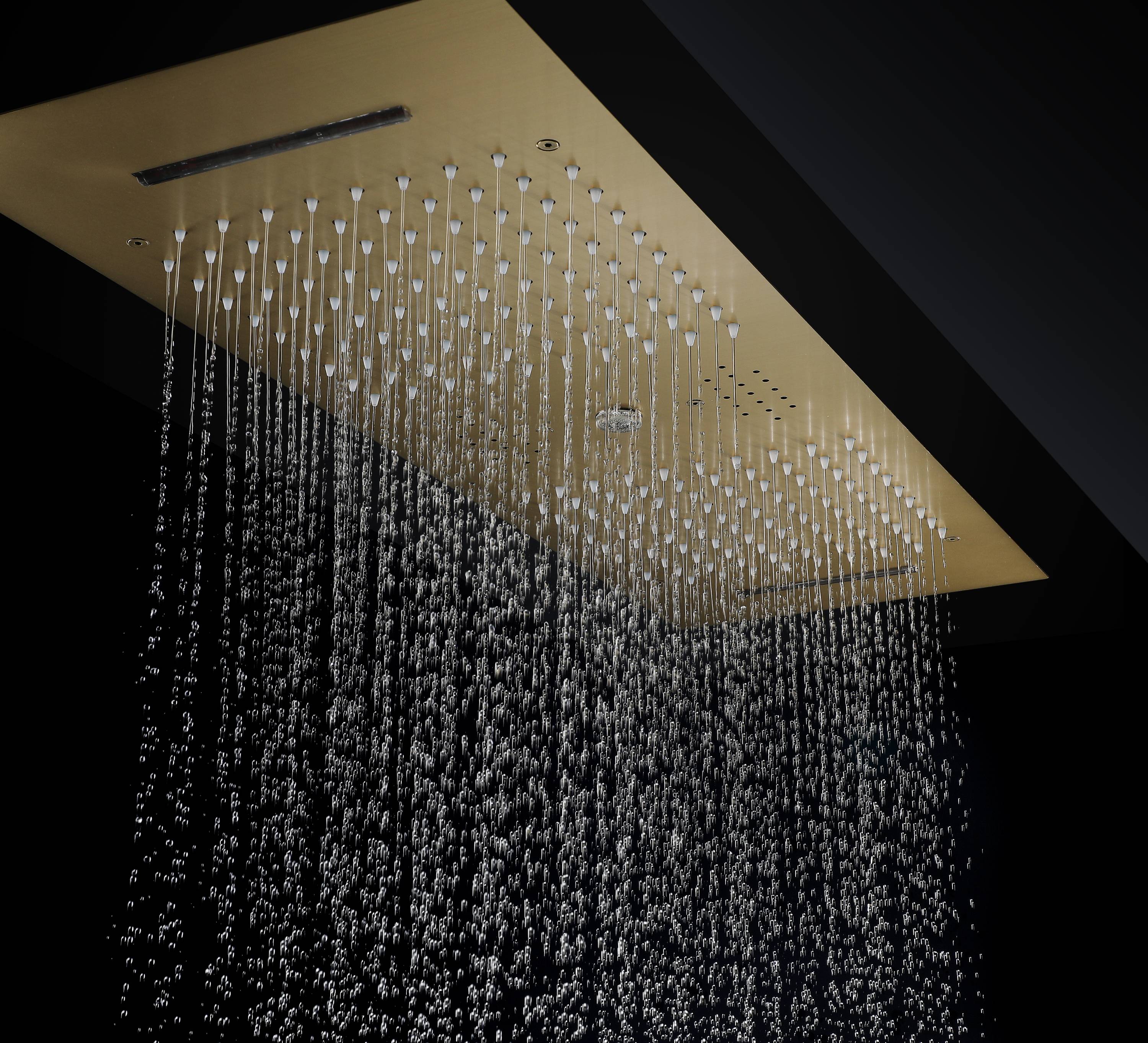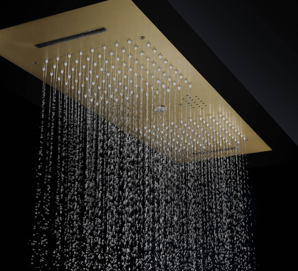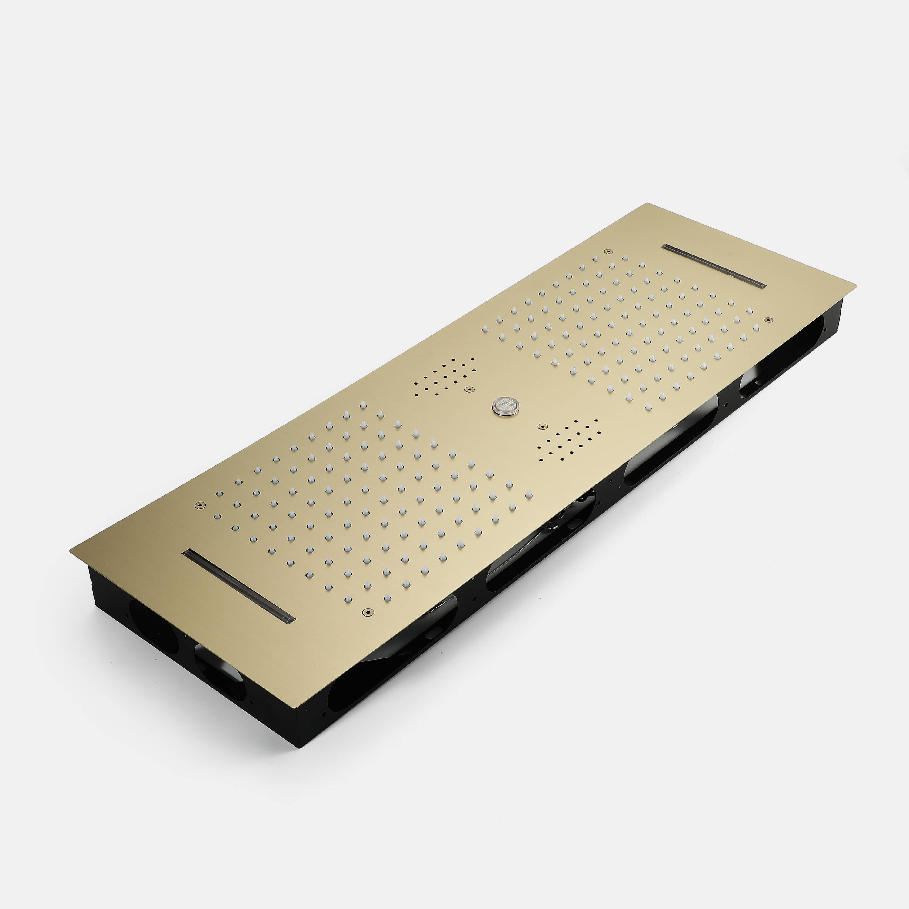 The generously sized 35.4 x 11.8-inch shower head offers dual-functionality, providing both waterfall and rainfall shower experiences. Crafted from durable 304 stainless steel and finished in brushed gold, it's a stunning centerpiece for any bathroom.