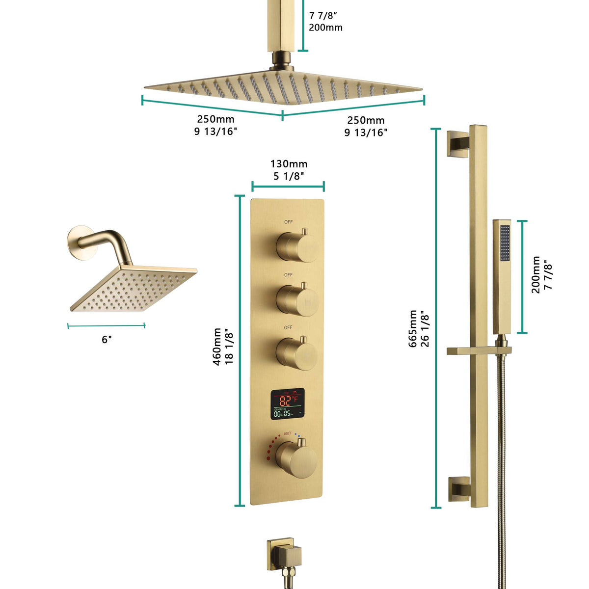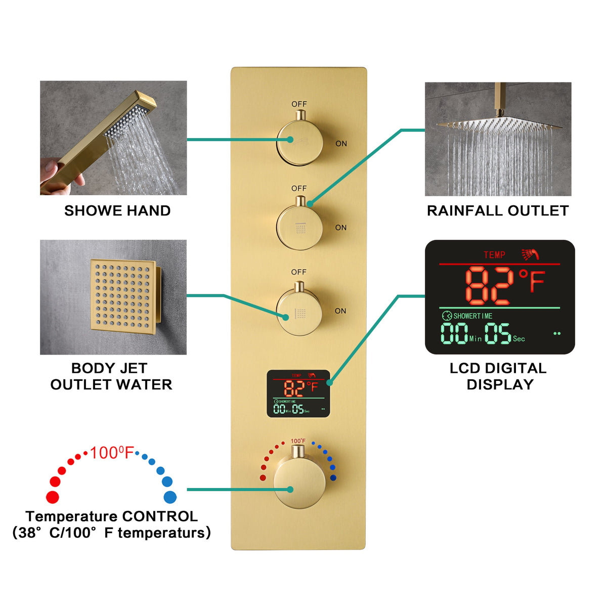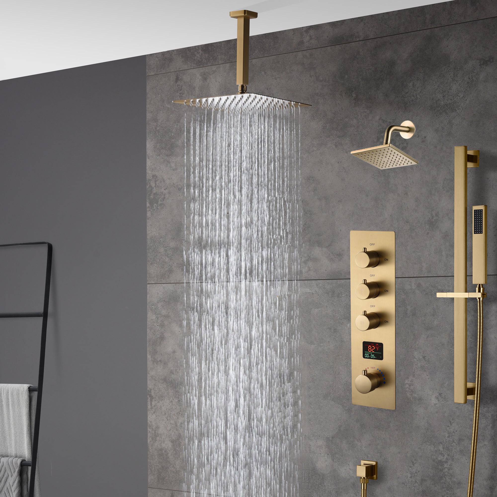 Brushed gold ceiling mount 12 inch or 16 inch rain head 3 way digital display thermostatic shower faucet with Regular head wall mount