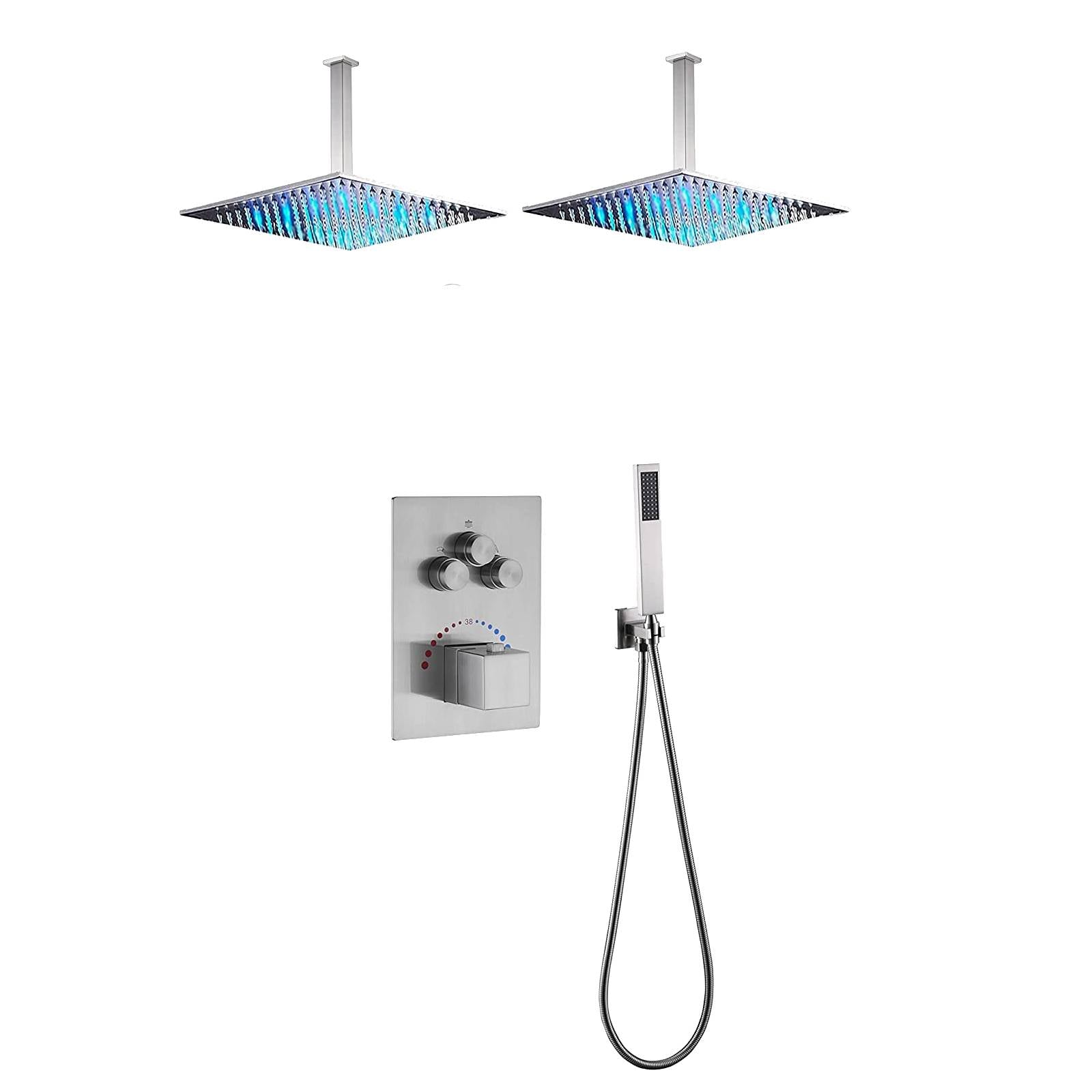 The rainfall shower heads come in two sizes, 12x12 inch and 16x16 inch. You can choose between an LED light shower head, which functions using water flow, or a non-LED light shower head.
