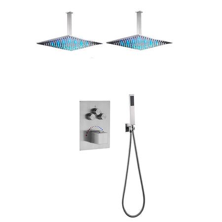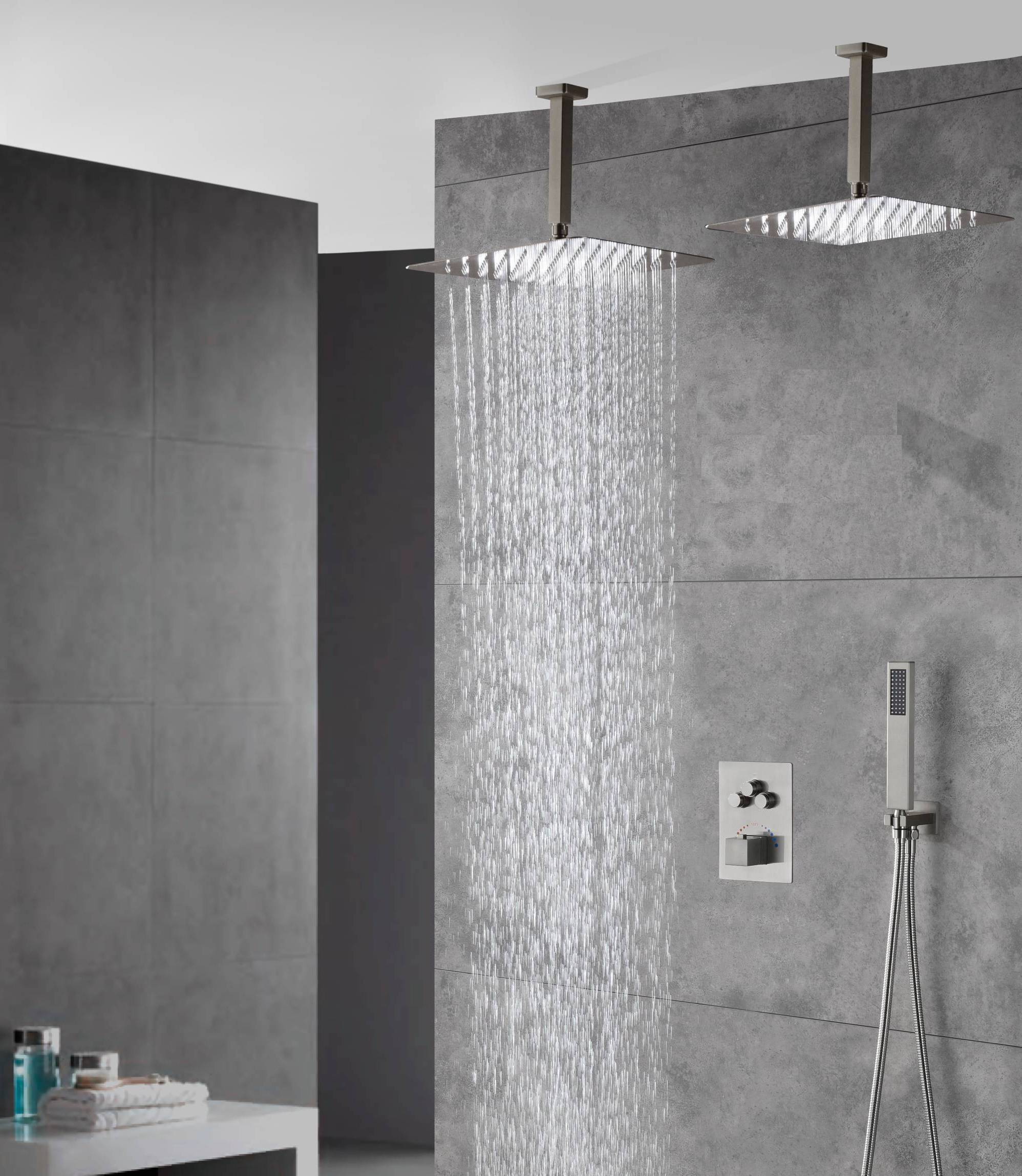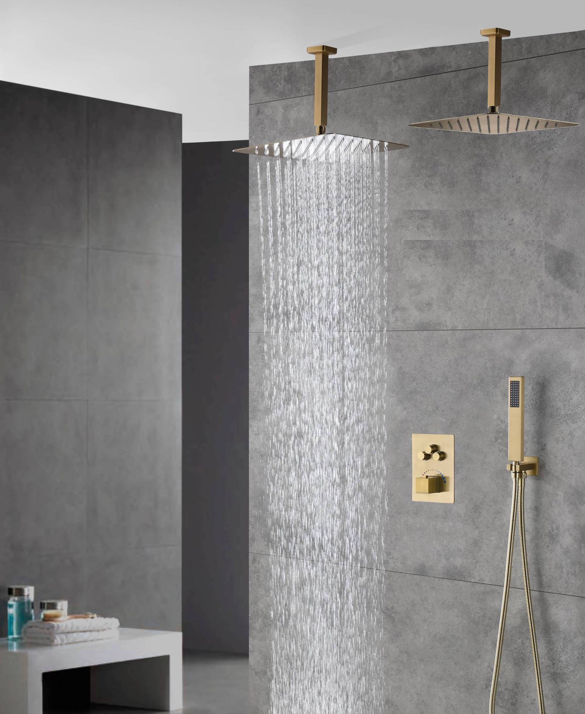 Brushed Gold Dual Ceiling & Wall Shower Heads with 3-Way Thermostatic Valve System - Seamless Functionality Both Together & Separately