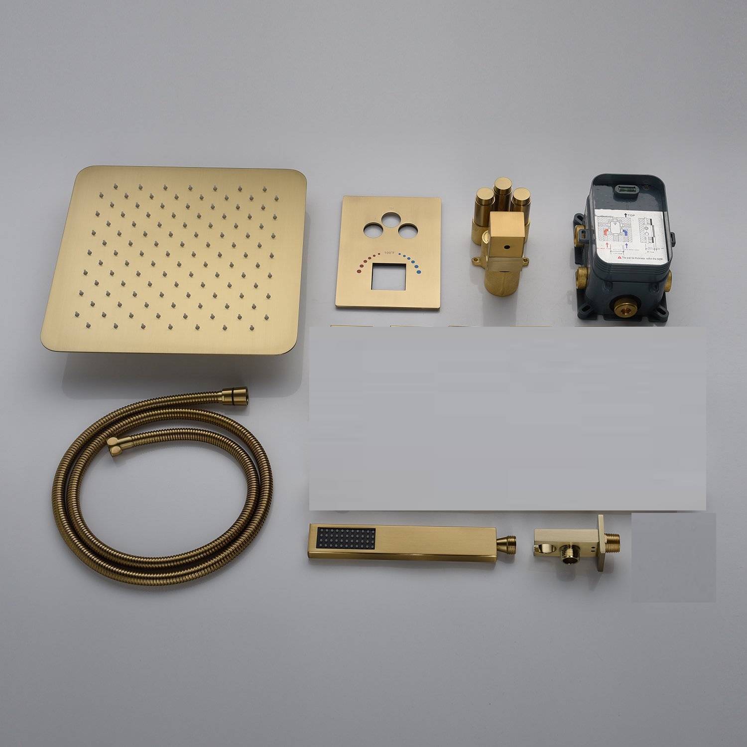 This complete set includes two brushed gold fixed shower heads, a brass handheld holder, Two 9.5” shower arms, a 59” shower hose, a 3-way thermostatic valve mixer, a 6-inch wall shower arm, and a brass shower holder,