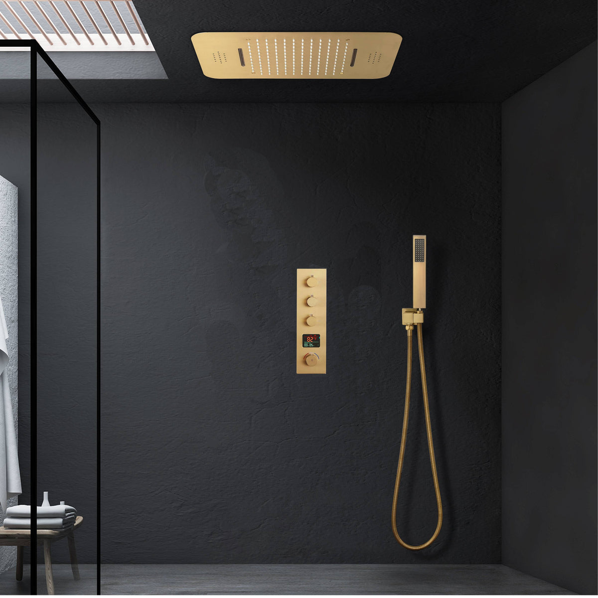 Brushed Gold Music 64 LED lights Flushed mount 23X 15inch shower head 3 way Digital display thermostatic valve that each function run all together and separately
