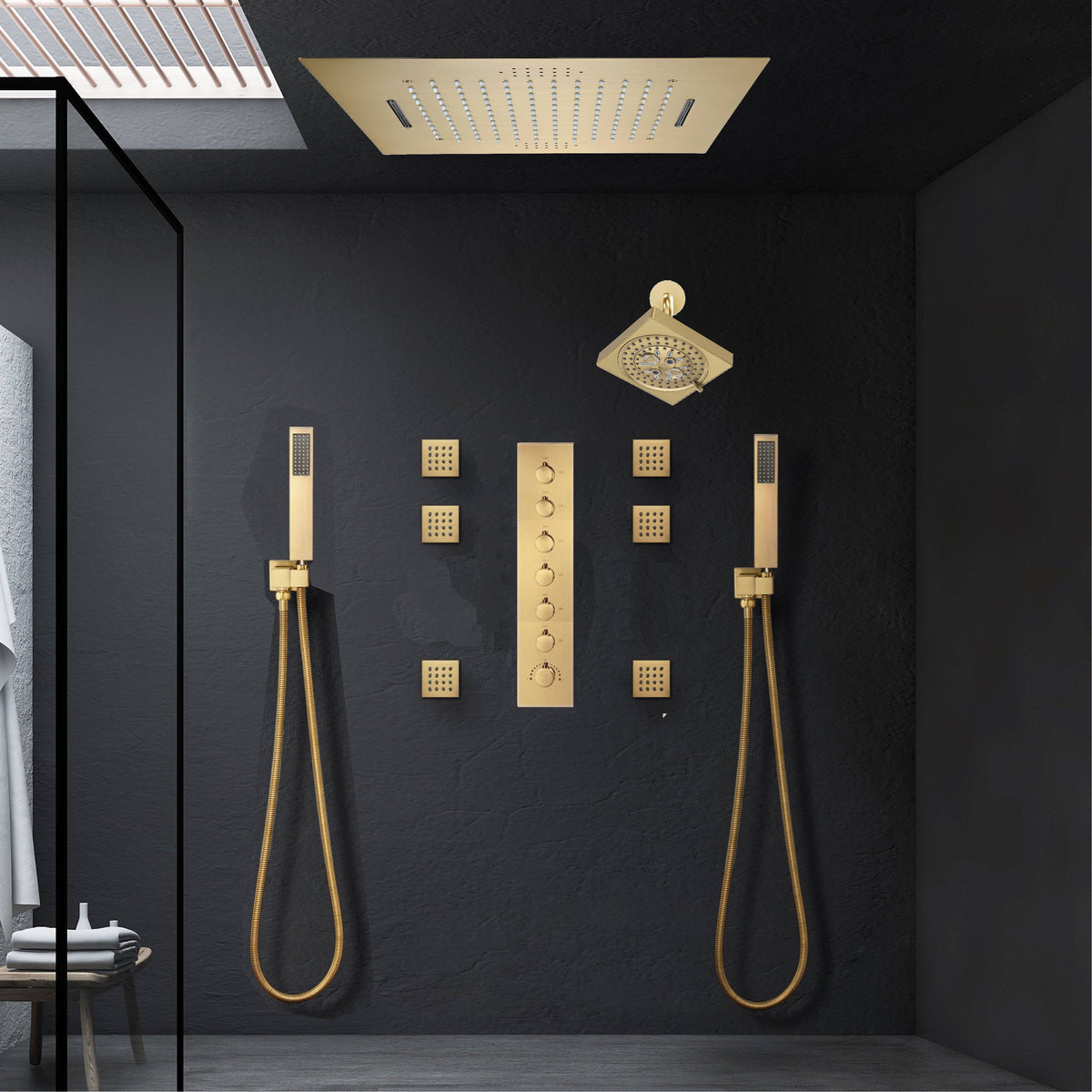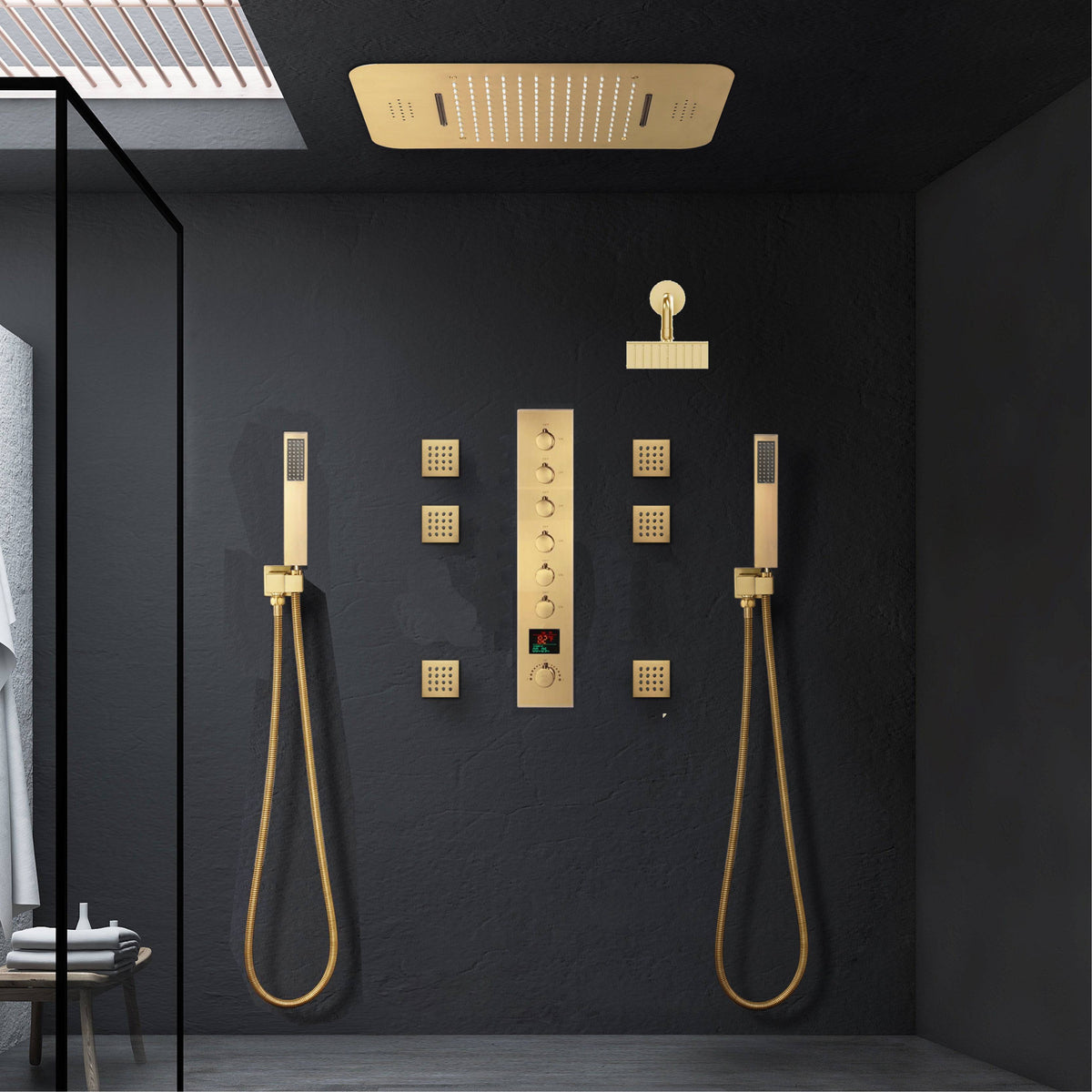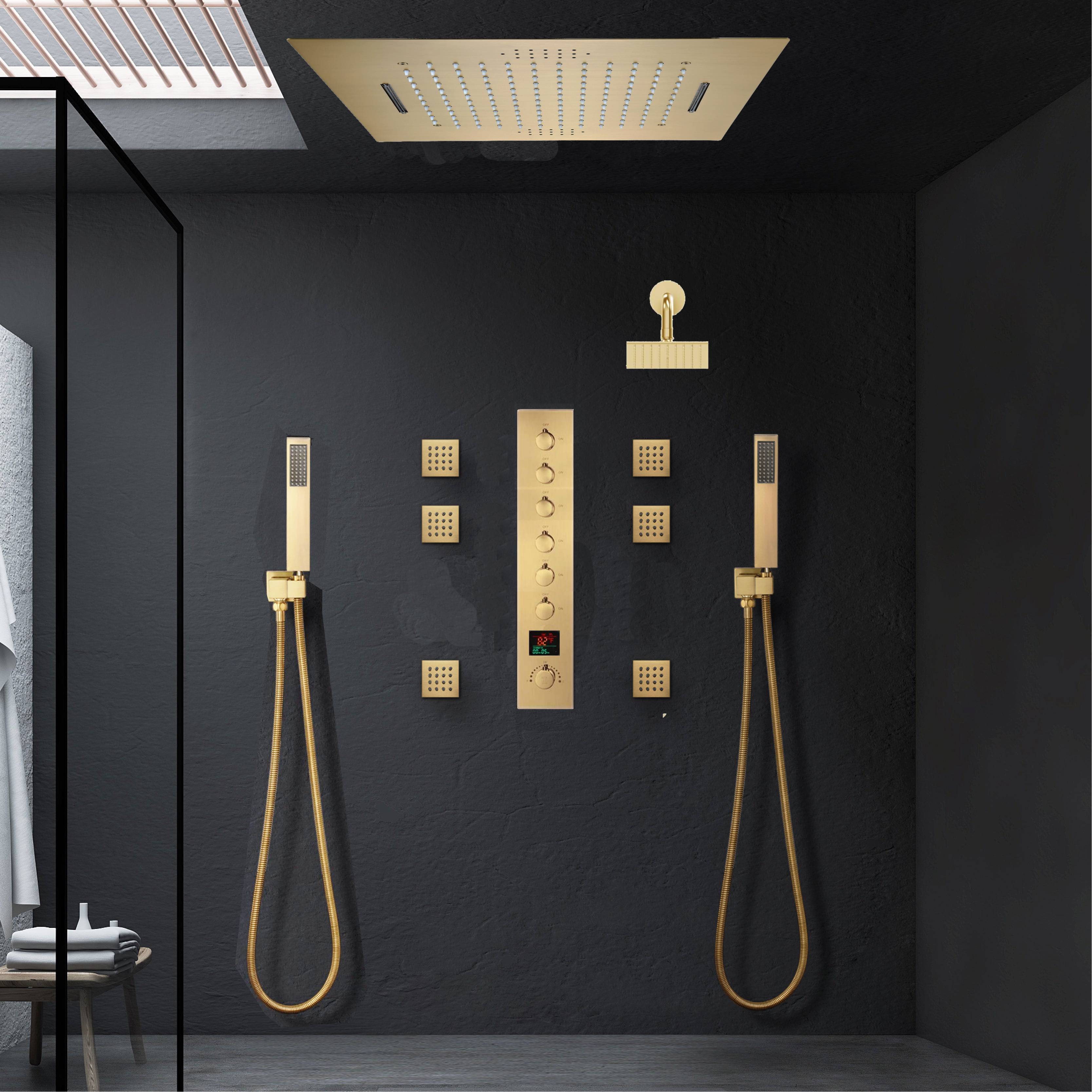Brushed Gold Music LED Shower System: Flush-In 23'' x 15'' or 20'' x 20'' Shower Head with 6-Way Digital Display Thermostatic Control, Regular Head & Body Sprayers