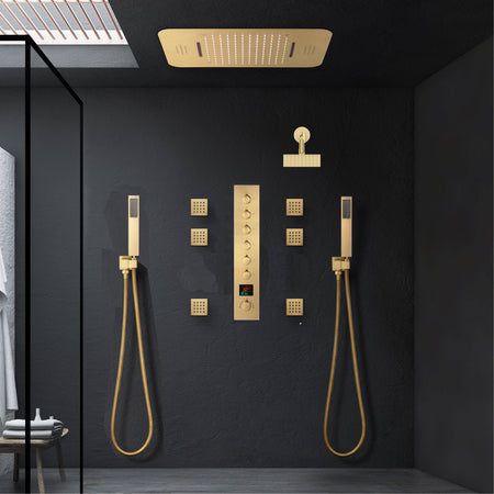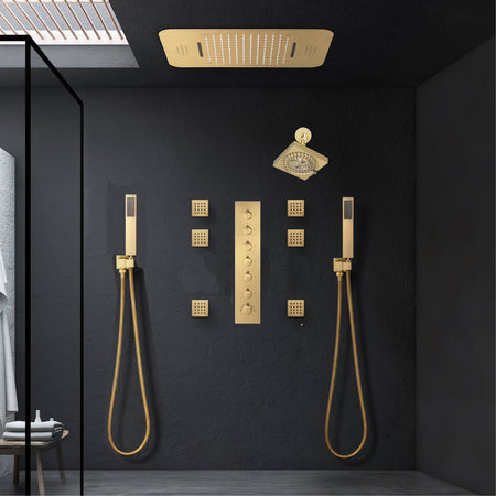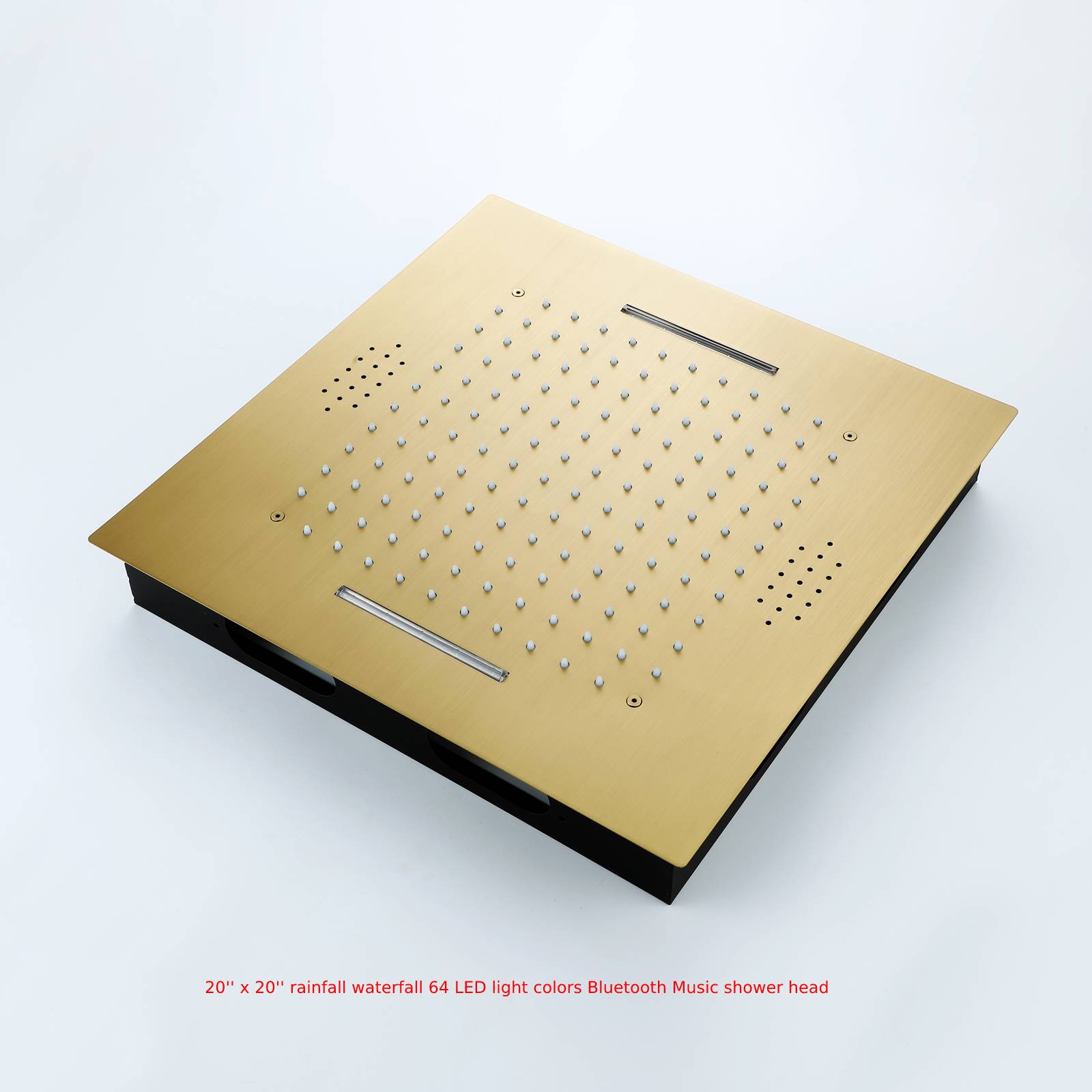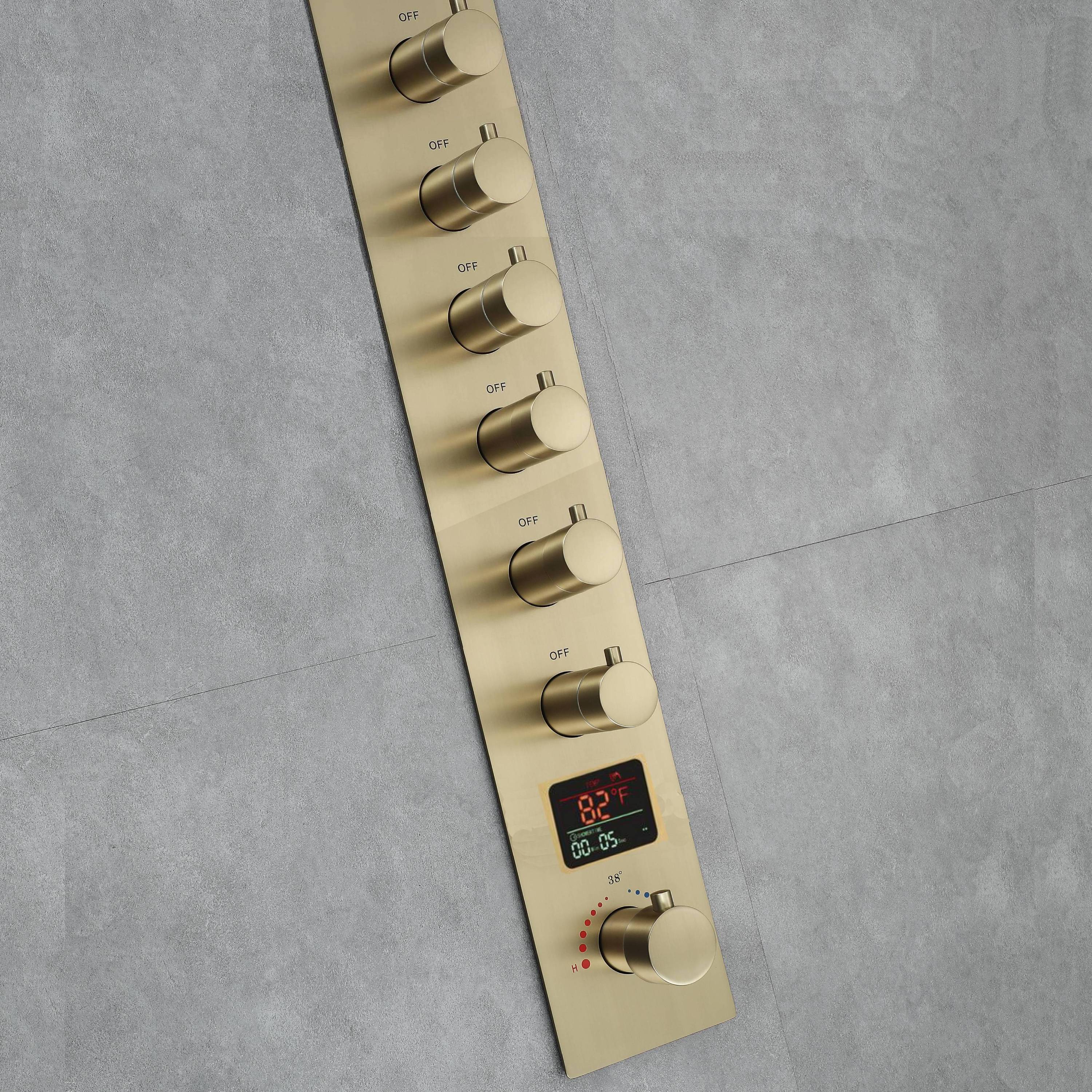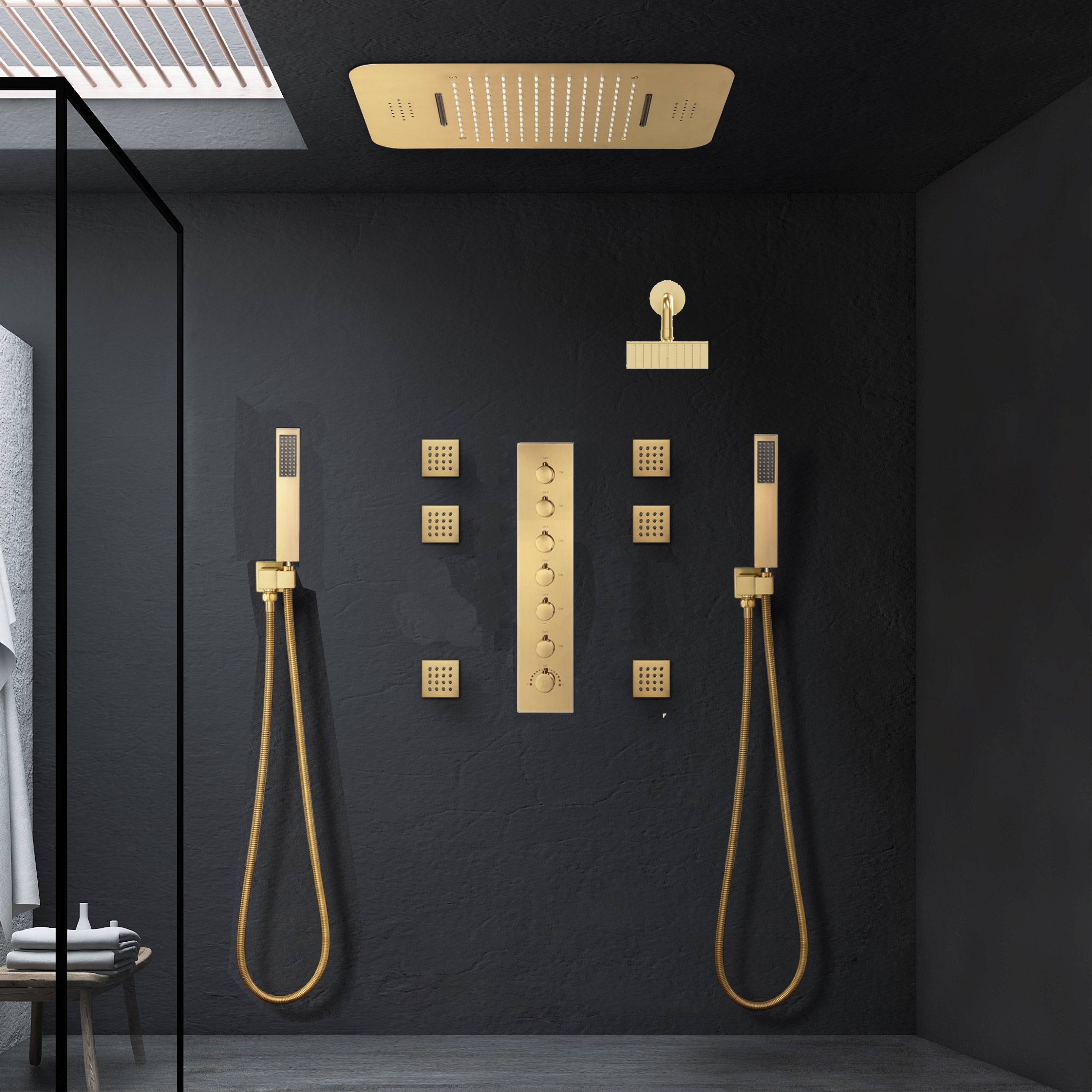 Brushed Gold Music LED Shower System: Flush-In 23'' x 15'' or 20'' x 20'' Shower Head with 6-Way Digital Display Thermostatic Control, Regular Head & Body Sprayers