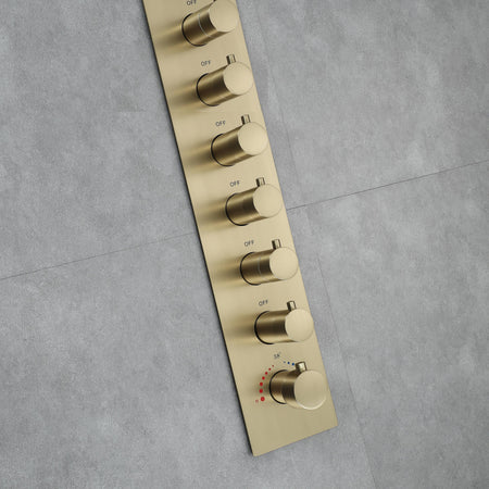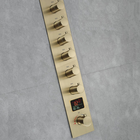 Experience a new level of showering luxury with our Brushed Gold 6-Function Thermostatic Shower System. This comprehensive set includes a LED Bluetooth Music Head, Regular Head, Body Sprayers, Dual handle sprayers and a thermostatic valve with a digital display that operates without a battery.
