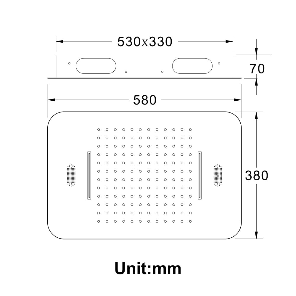 - Head: 23x15'' Or 20'' x 20'' LED Bluetooth Music stainless-steel head that flushes in.