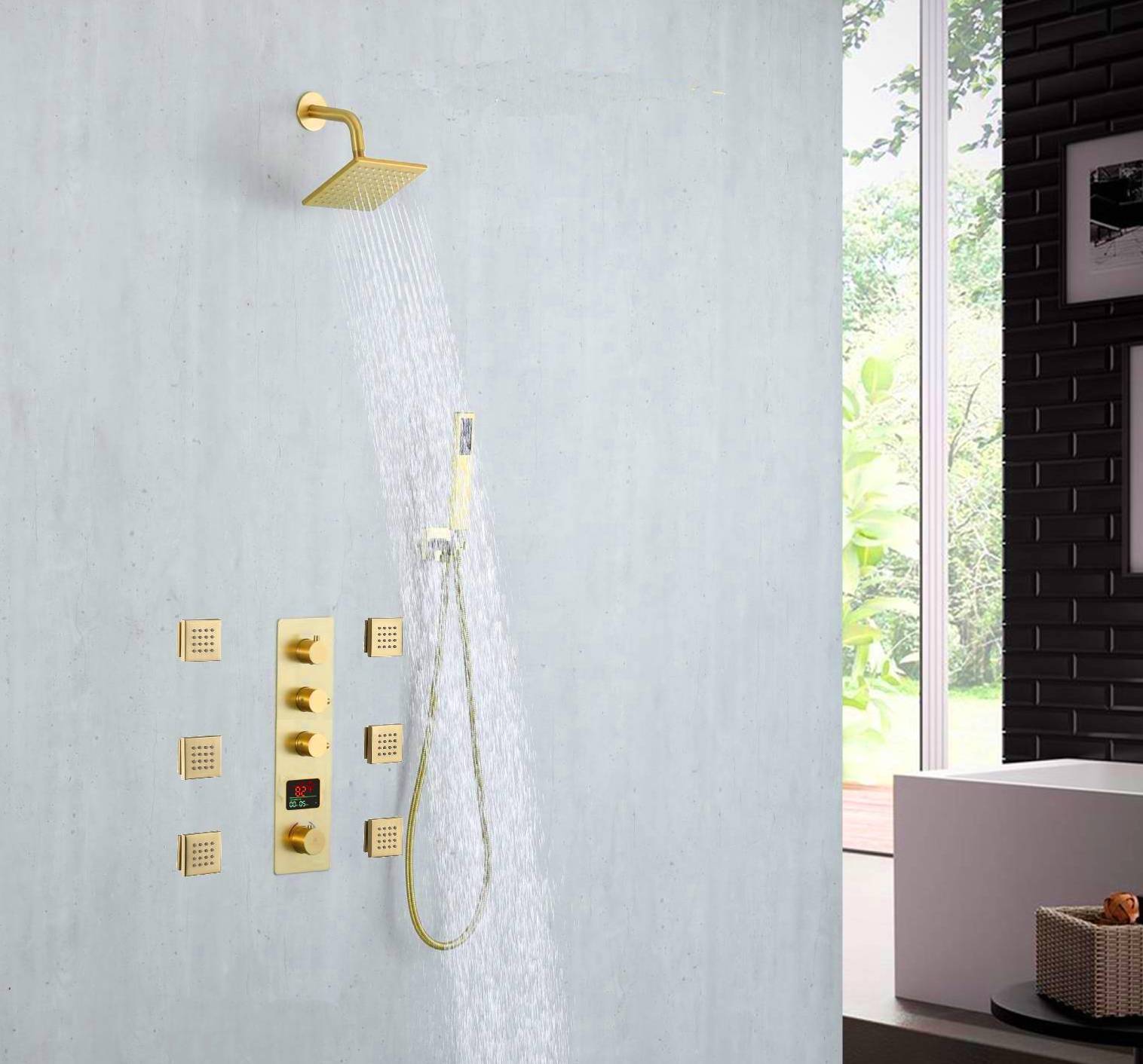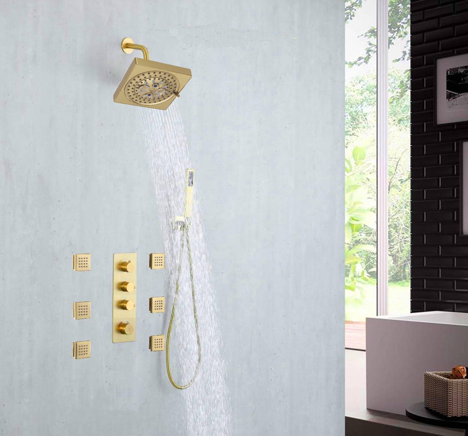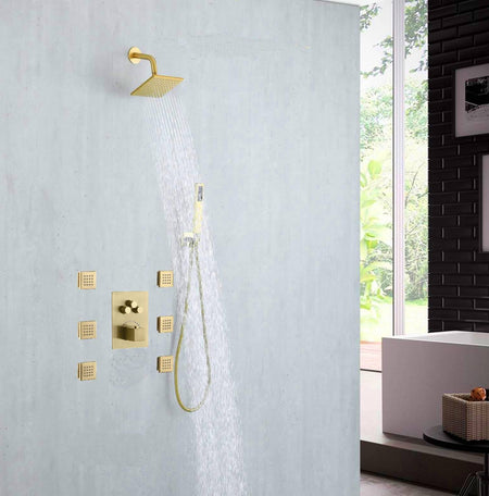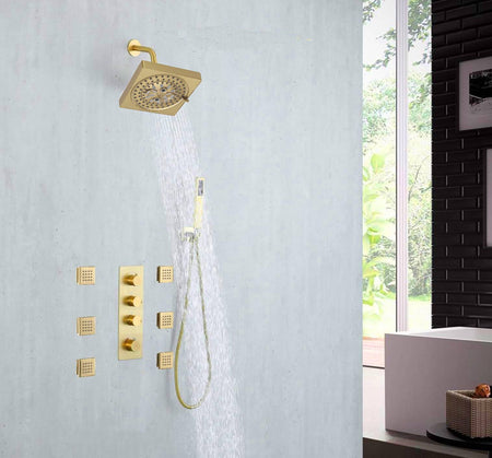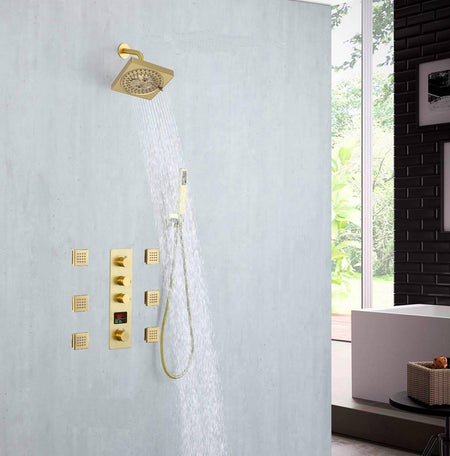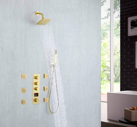 This Brushed Gold 3-Way Digital Display Thermostatic Shower System with Body Jets and a 6-inch Regular Head offers a perfect blend of luxury, safety, and state-of-the-art technology, transforming your everyday showering into a spa-like experience.