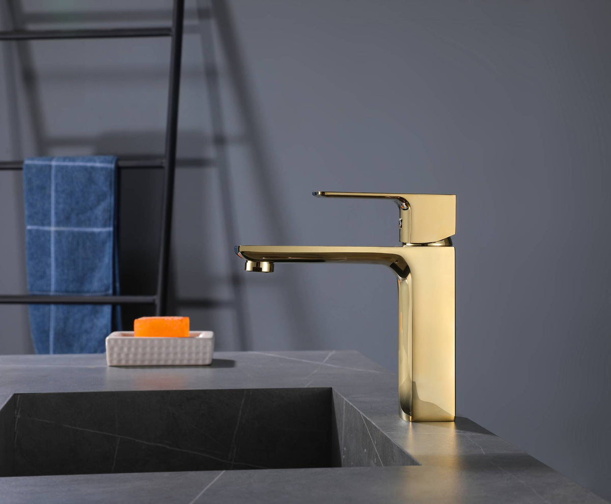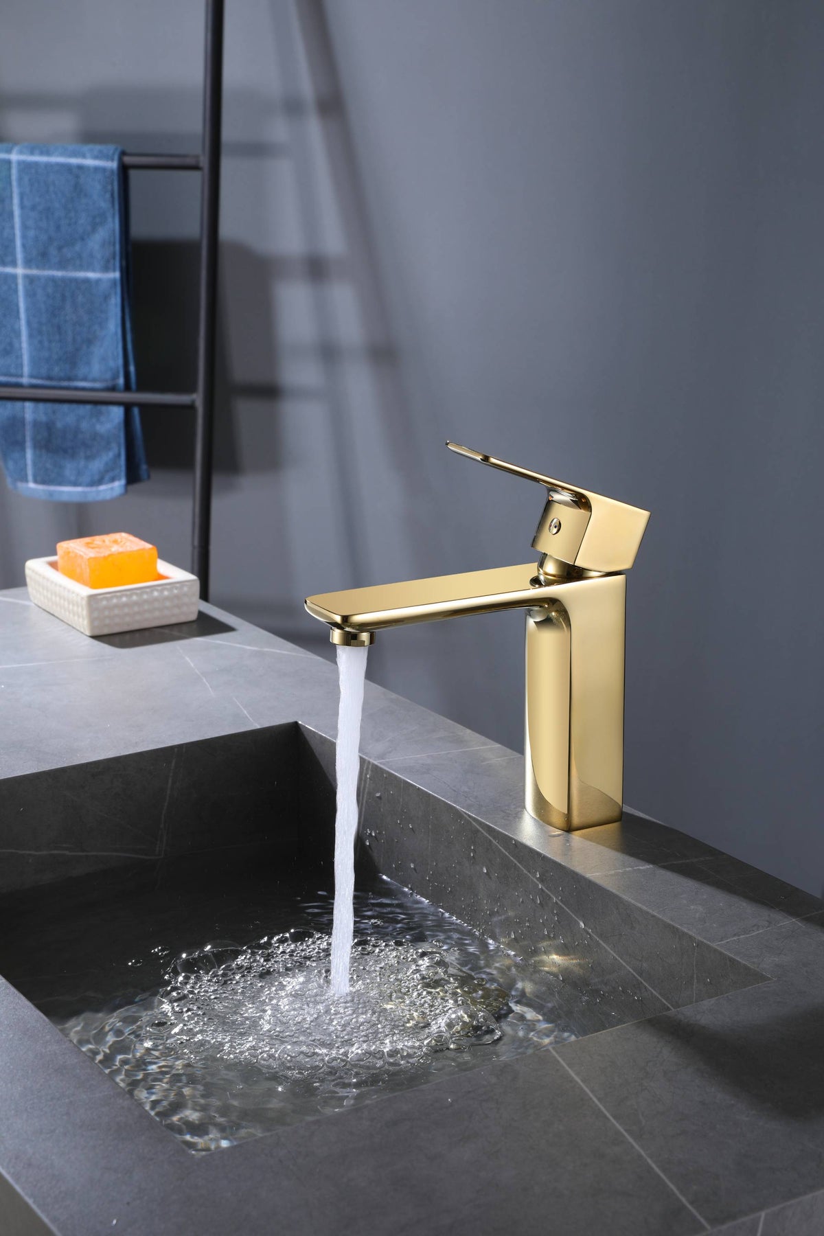 This polished gold basin faucet is not only practical, but it also adds a touch of high-end luxury to your bathroom. With its solid brass body, zinc alloy handle, and ceramic valve, it ensures durability and reliable performance. The deck-mounted design and polished gold finish further boost its aesthetic appeal. Upgrade your basin area with this stylish and premium-quality fixture.