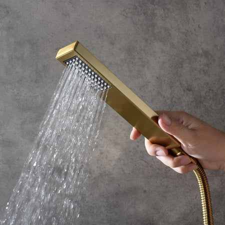 Indulge in luxury with our brushed gold wall-mounted shower system. Designed for installation on tile walls and other surfaces, this system features a 12-inch rainfall shower head, 6 jets,a high-pressure handheld shower, a tub spout, all in a stunning brushed gold finish.