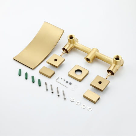 This brushed gold waterfall wall mount bathroom sink faucet combines functionality with style. Its waterfall design, combined with a brushed gold finish and square knob handles, make it a modern, stylish choice for your bathroom. Its lead-free solid brass construction, UPC ceramic cartridge, and included overflow brass pop-up drain ensure its longevity and reliable performance.
