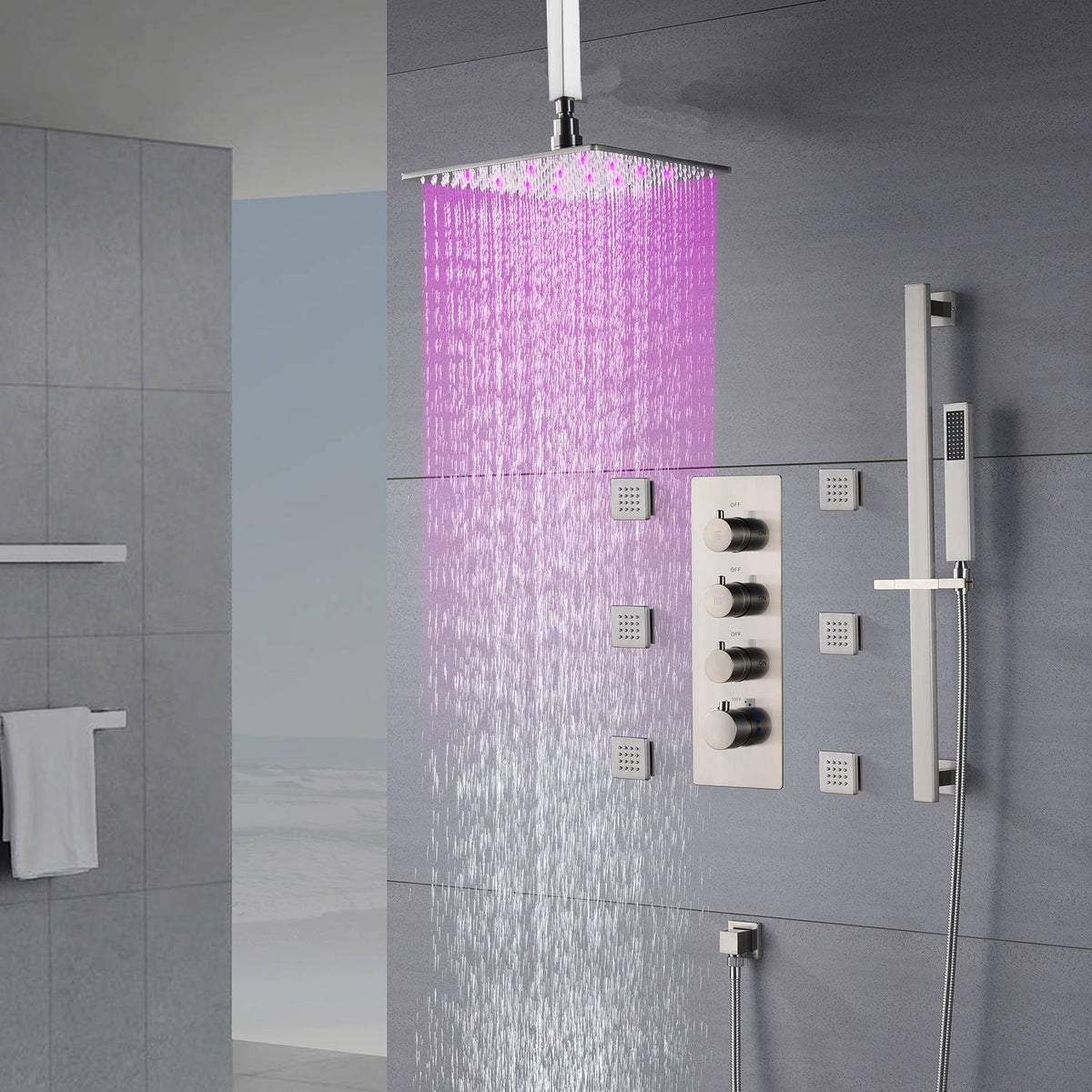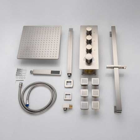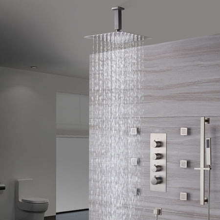 Brushed Nickel Ceiling-Mounted Rain Shower System: Available in 12'' or 16'', with Optional LED Light, Includes 6 Body Jets and 3-Way Thermostatic Shower Faucet, Each Function Works Simultaneously or Separately