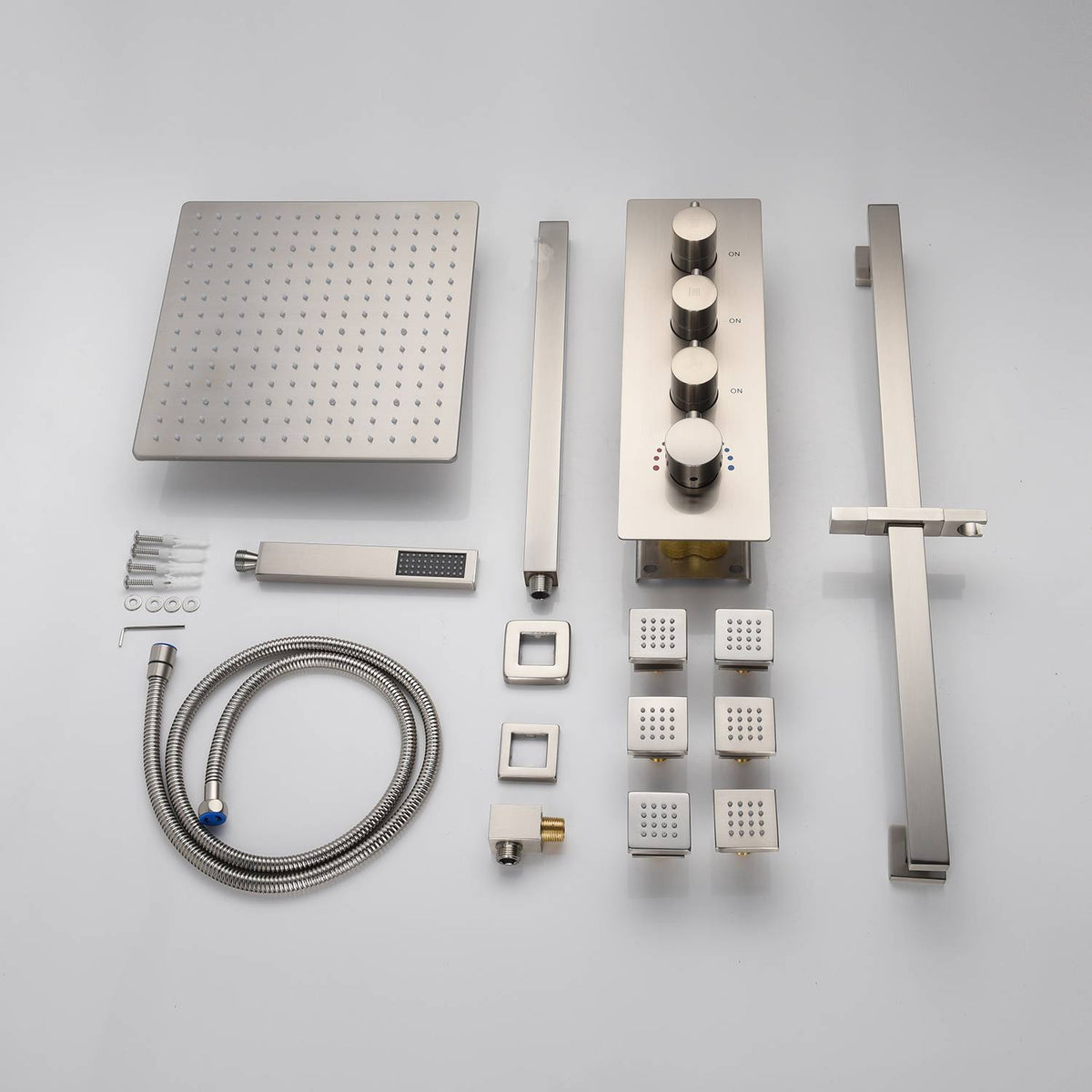6pcs Shower Body Jets: These body jets offer a massage feature and a 360-degree adjustable swivel angle for a spa-like shower experience. They're made of brass, finished in brushed nickel, and connect via an NPT 1/2" nipple standard.
