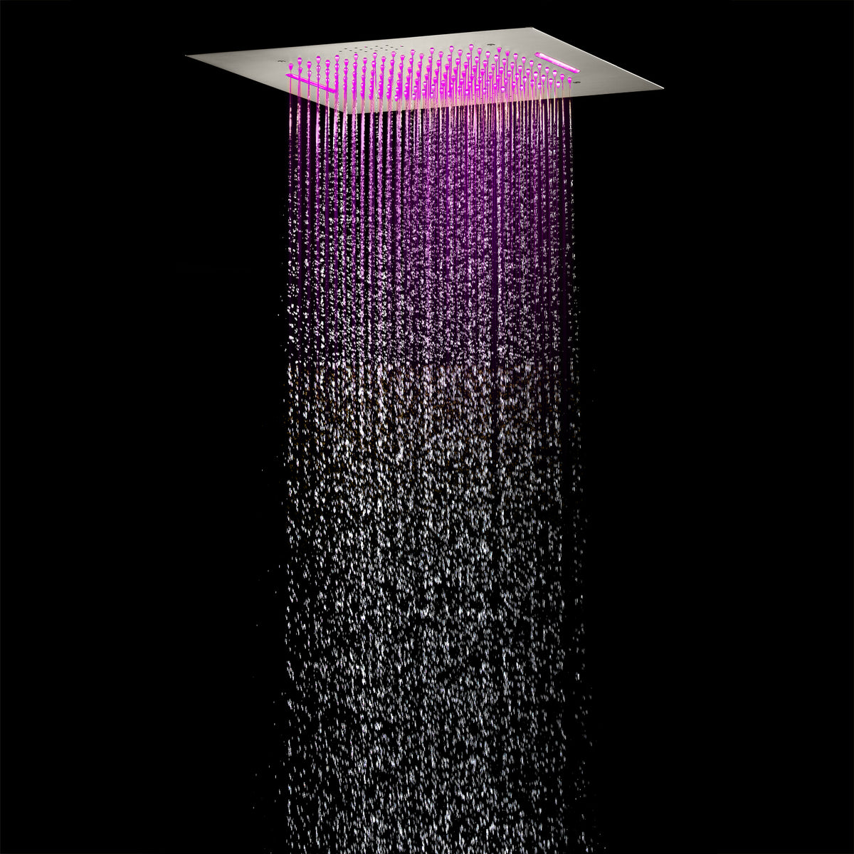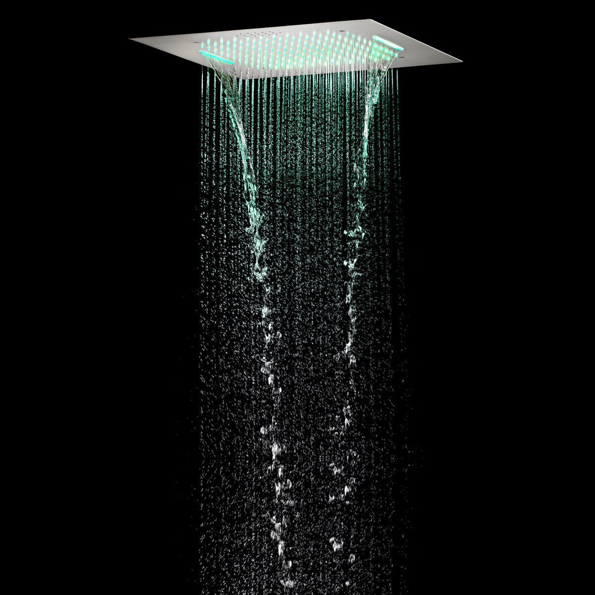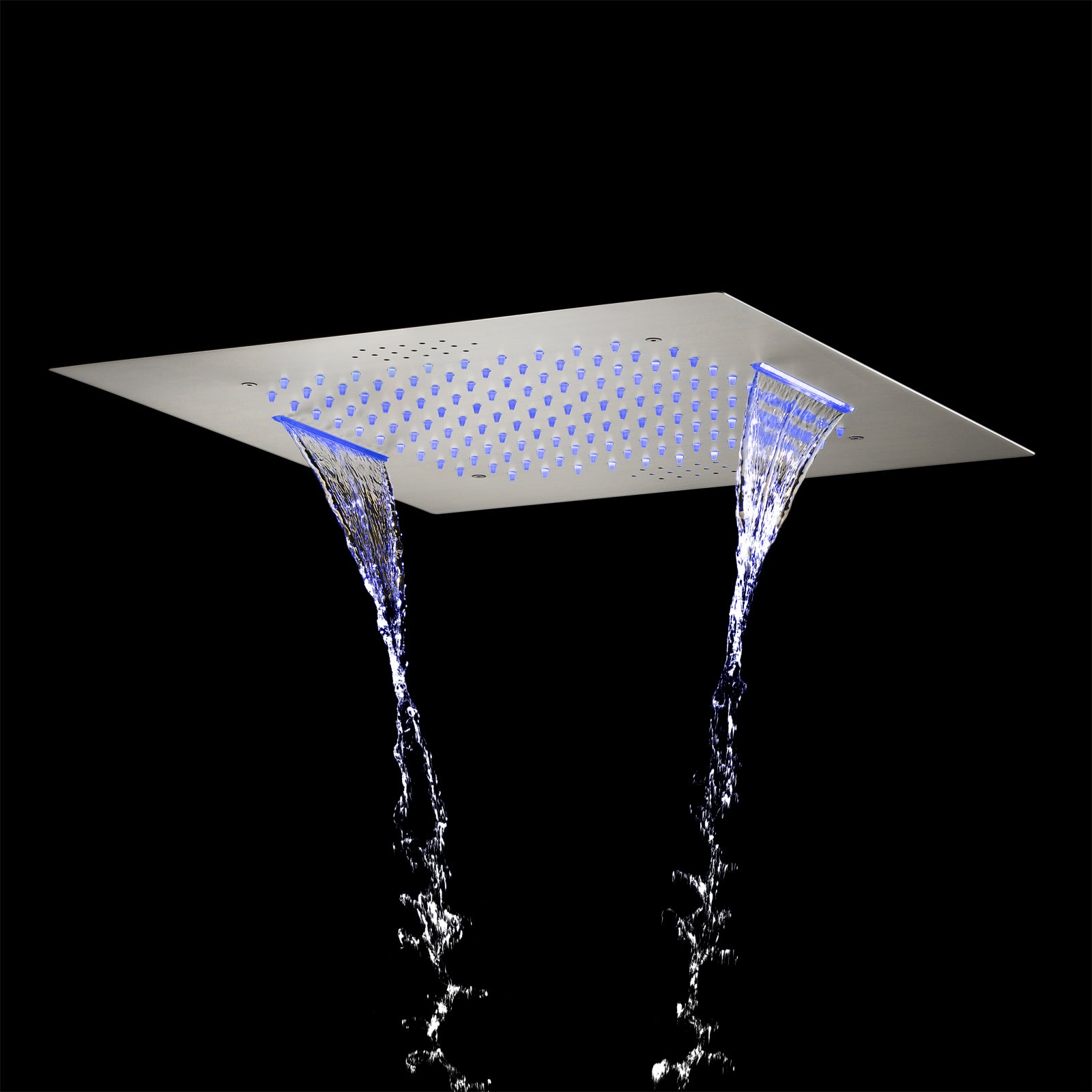 Our 20 x 20-inch shower head integrates rainfall, waterfall, and 64 LED light features along with Bluetooth music functionality. The LED lights and music can be switched on or off as per your preference while showering. Each function can operate simultaneously or separately for a personalized shower experience.
