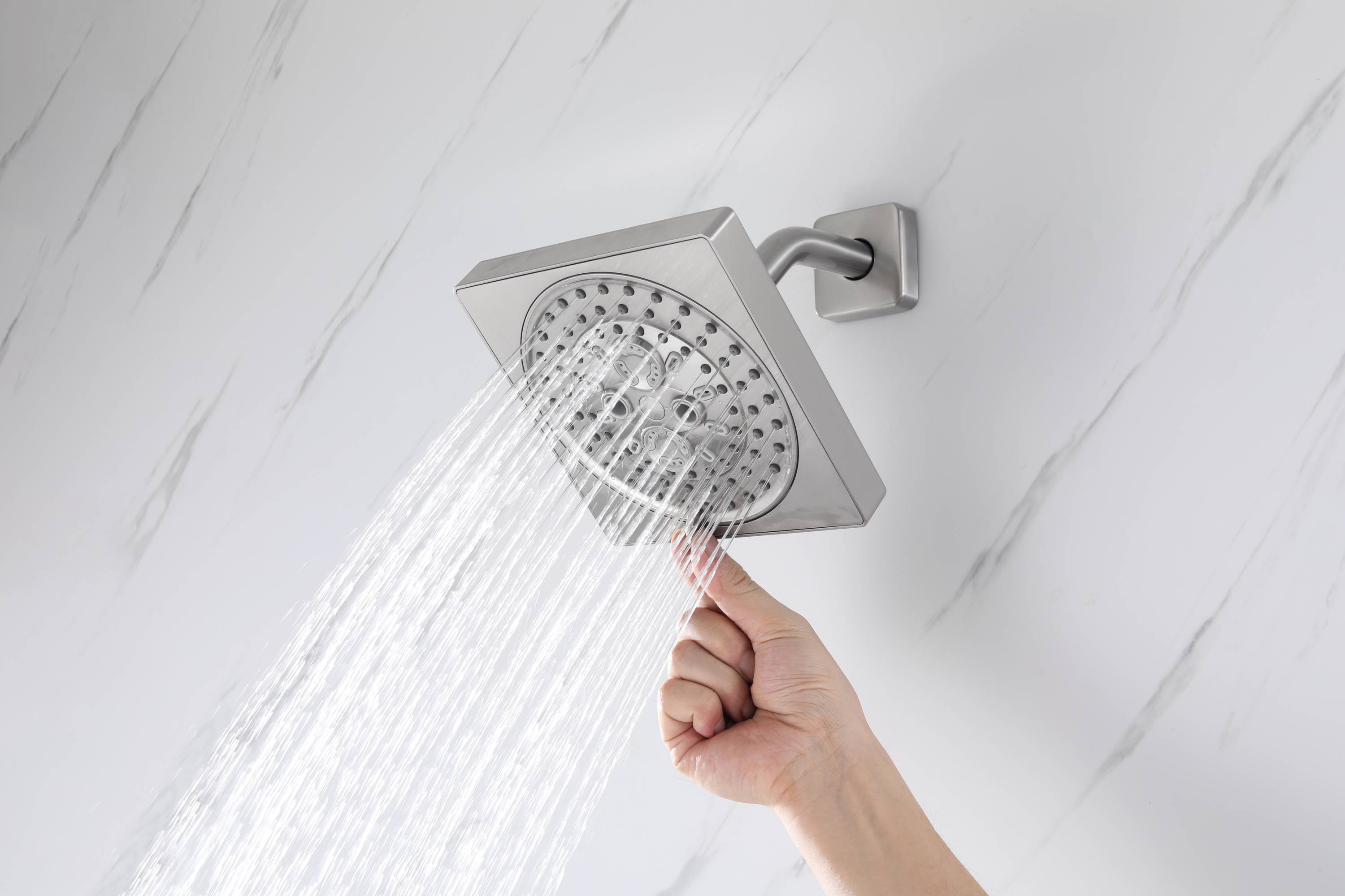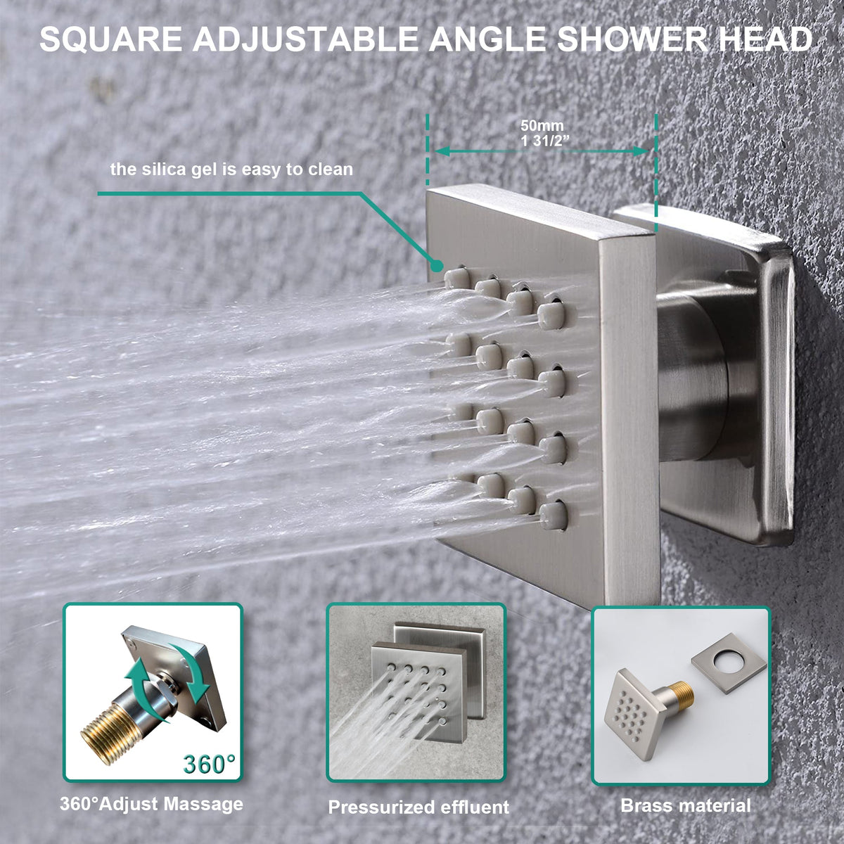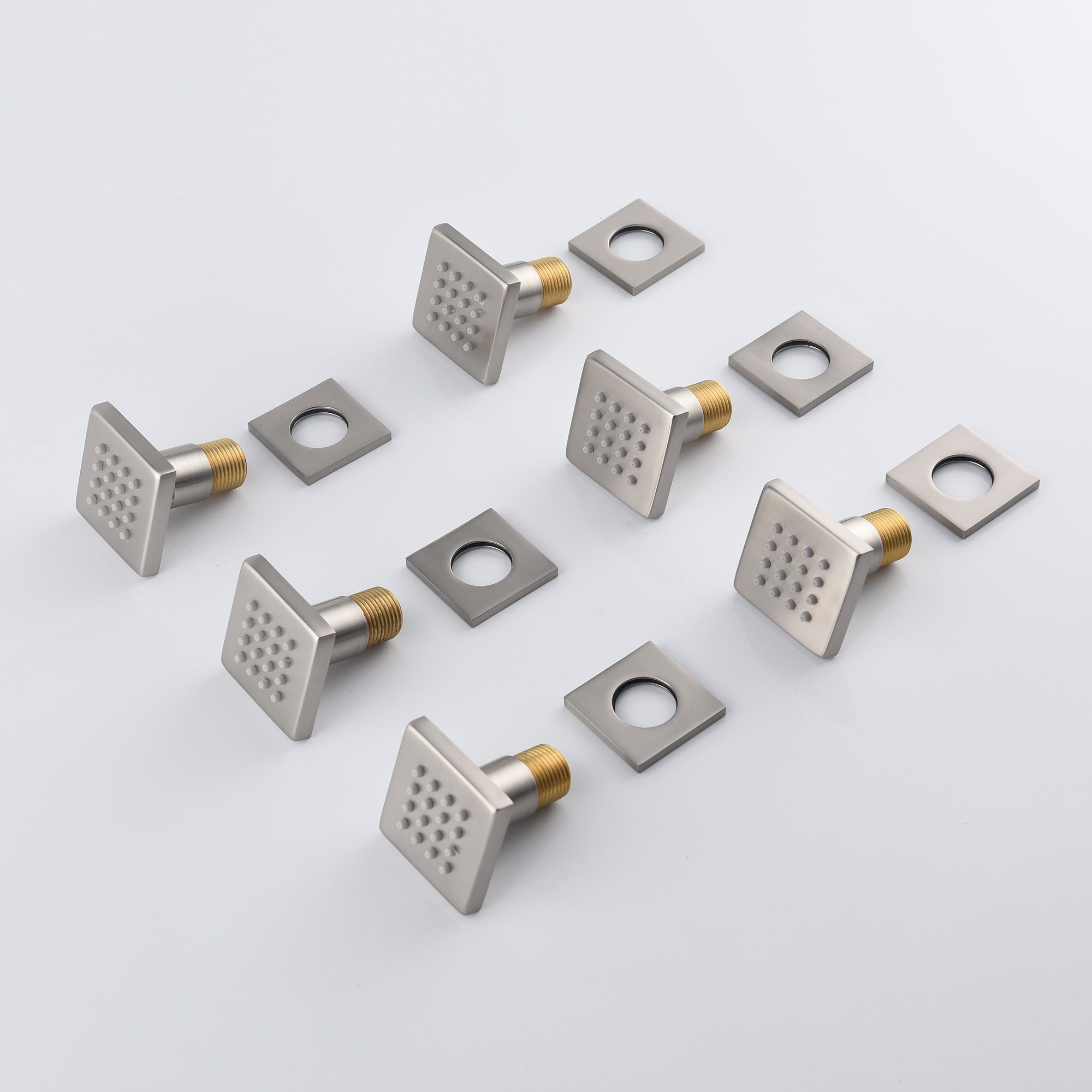 The shower system includes adjustable 2 x 2-inch body jets and a 6 x 6-inch regular shower head, giving you a high-pressure shower experience. The shower system is compatible with 3/4 inch or 1/2 inch water pipes for the hot and cold water mixer inlet, and 1/2 inch for other connections. It operates effectively within a water pressure range of 70 to 90 PSI and handles water flows from 2.5 to 6.5 GPM.