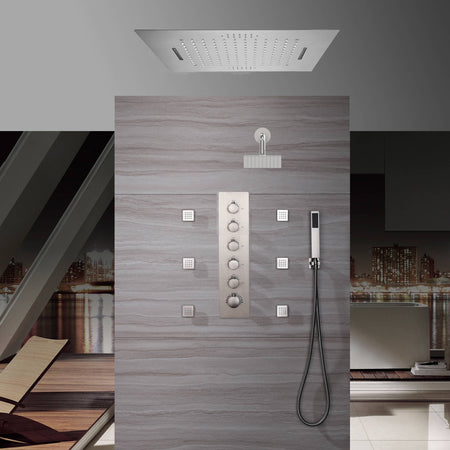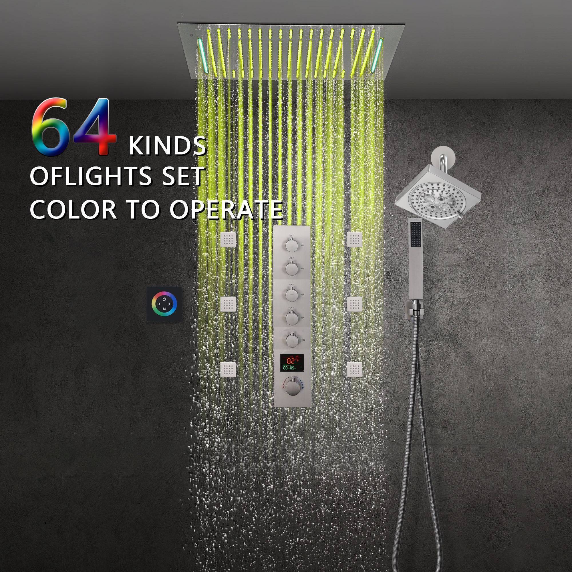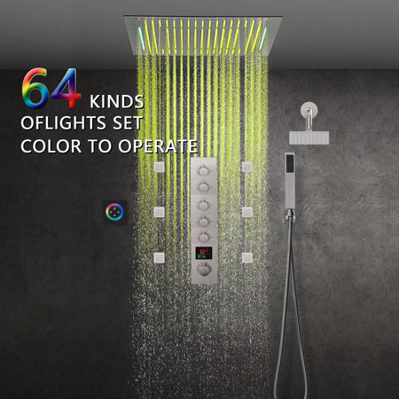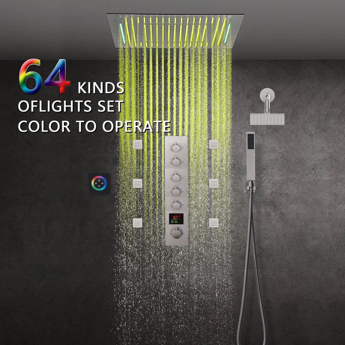 Flush-Mounted Brushed Nickel 5-Way Digital Thermostatic Shower System: with Six Body Jets, Regular Head, and 20-Inch Rainfall Waterfall LED-Lit Bluetooth Music Shower Head