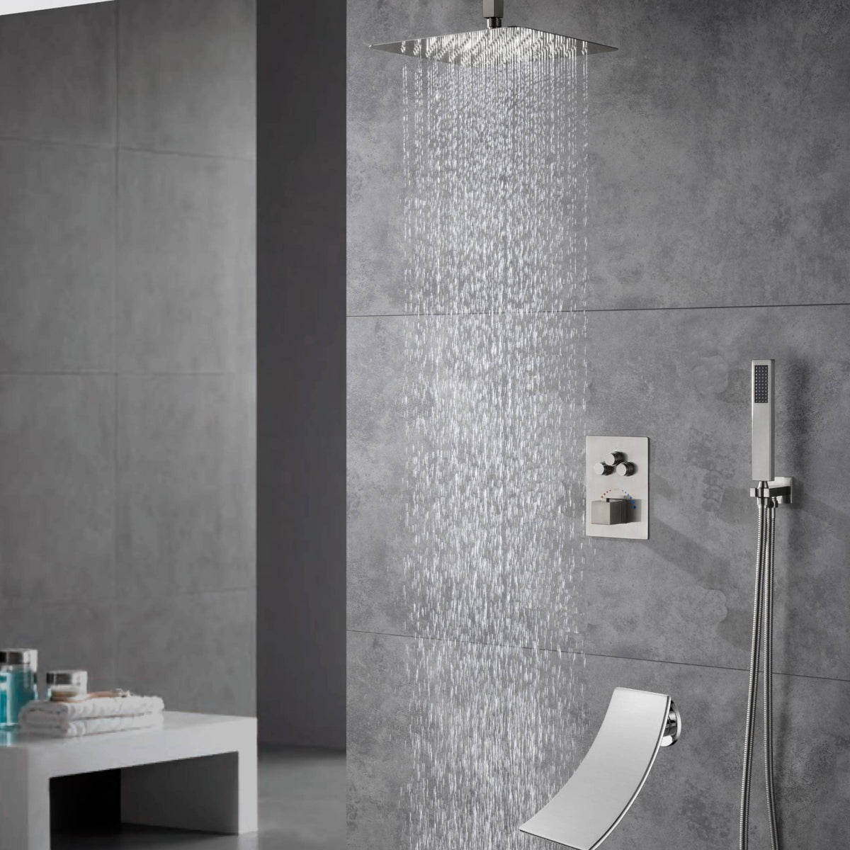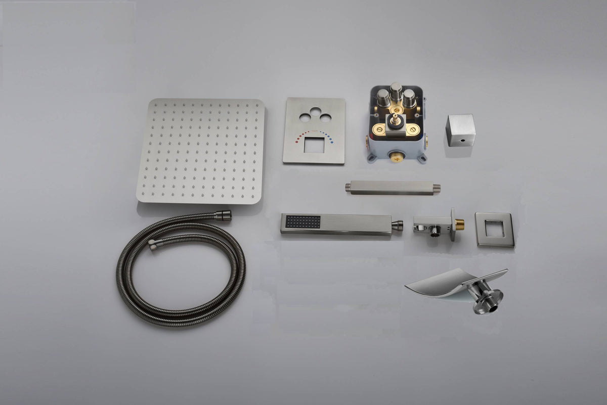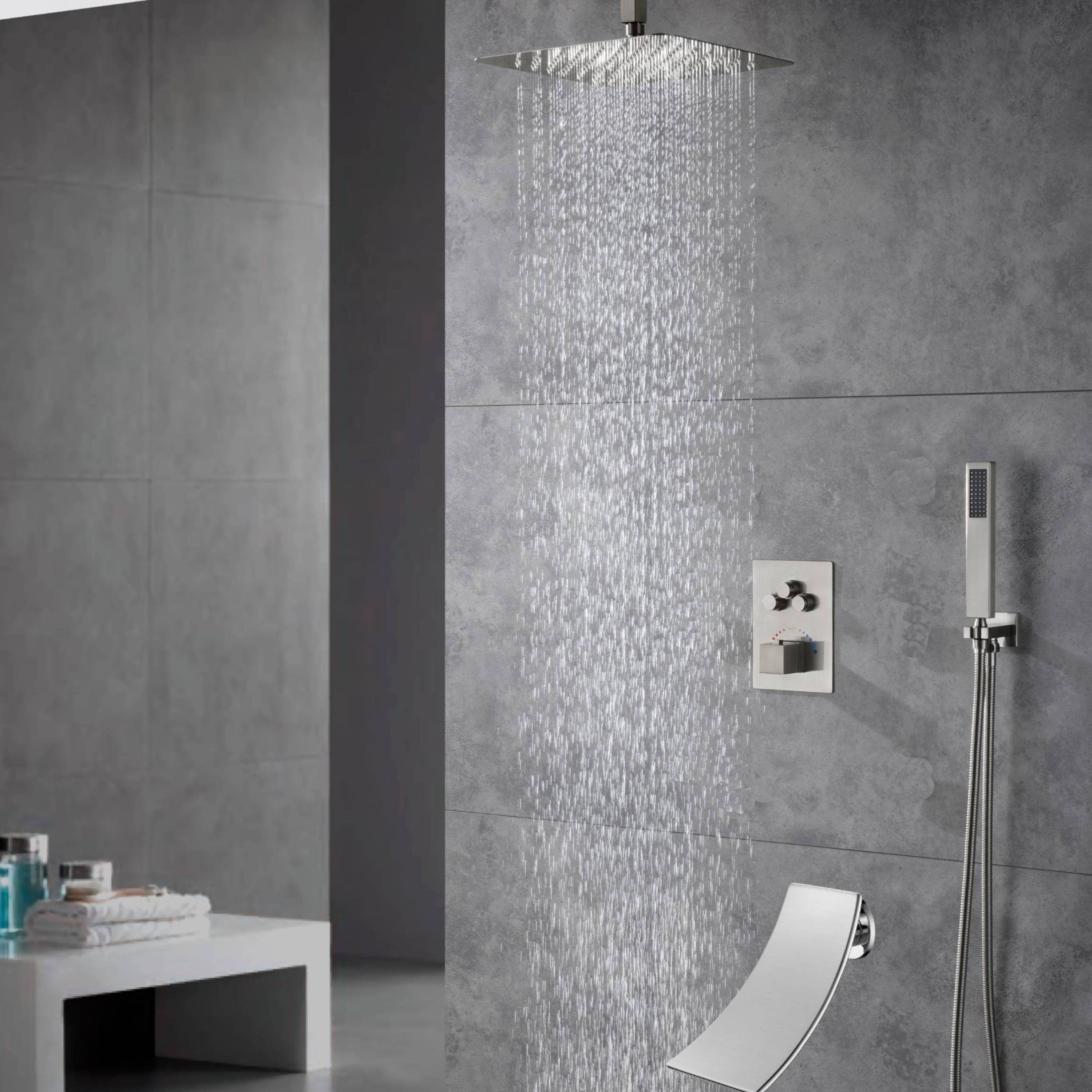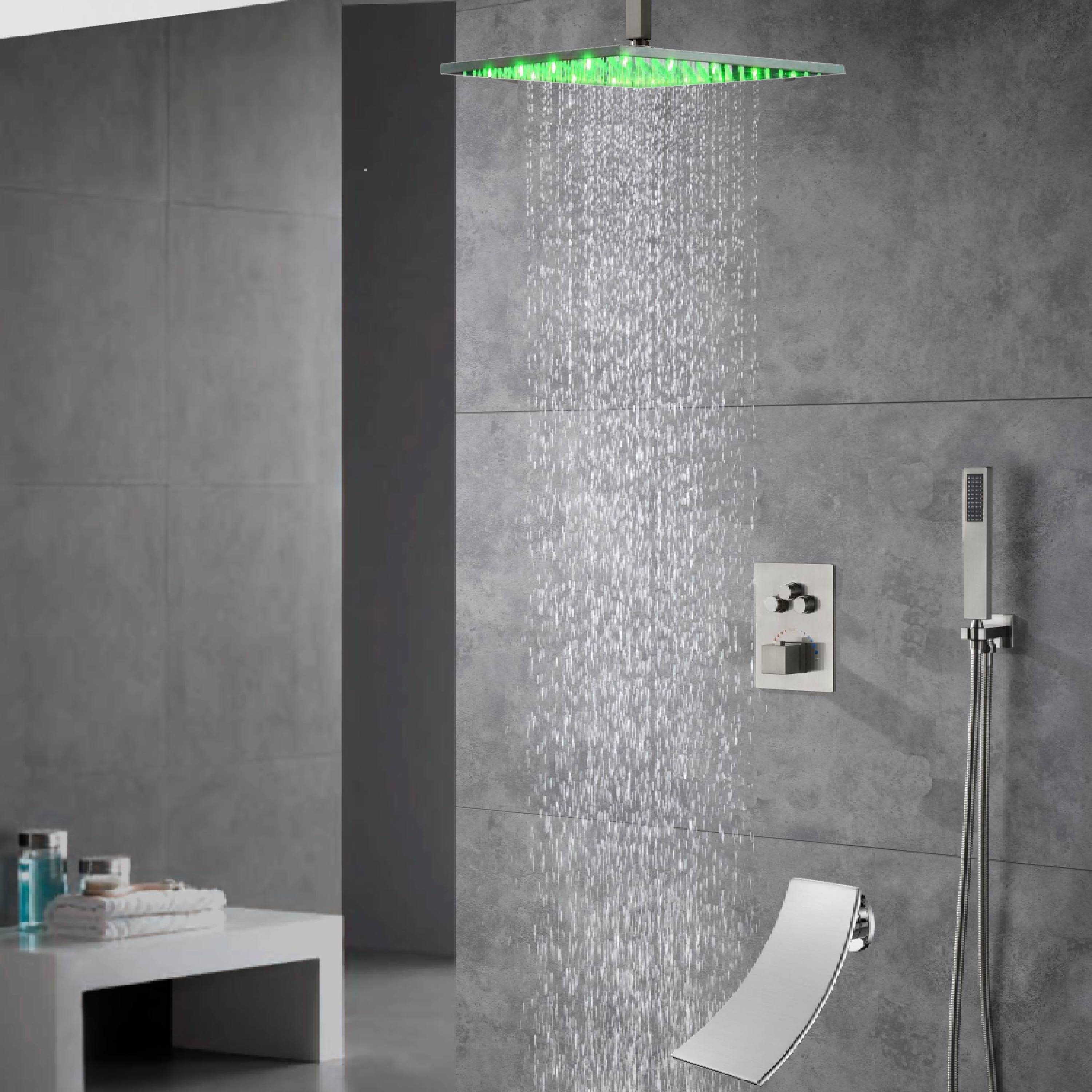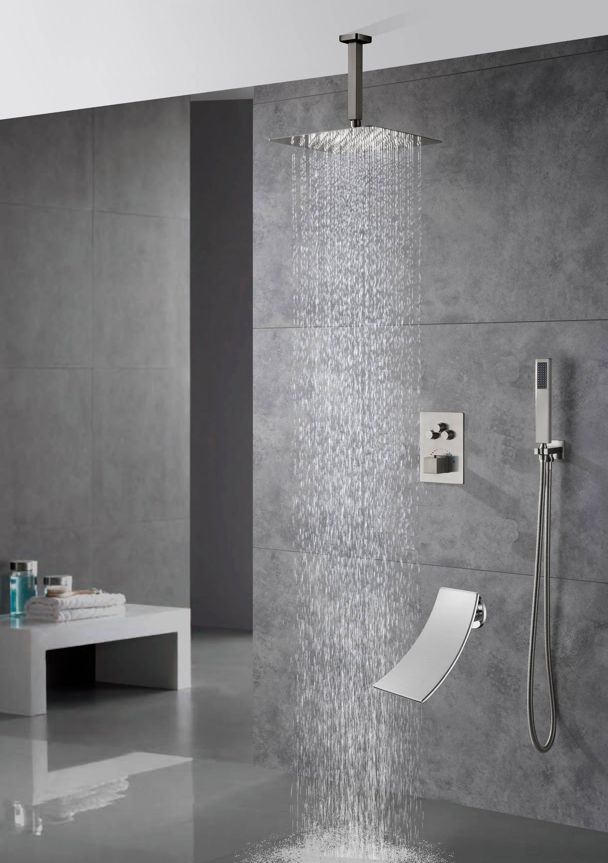 Ceiling mounted 3 functions Thermostatic Brushed Nickel rain Shower Faucet With waterfall tub spout
