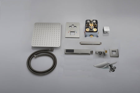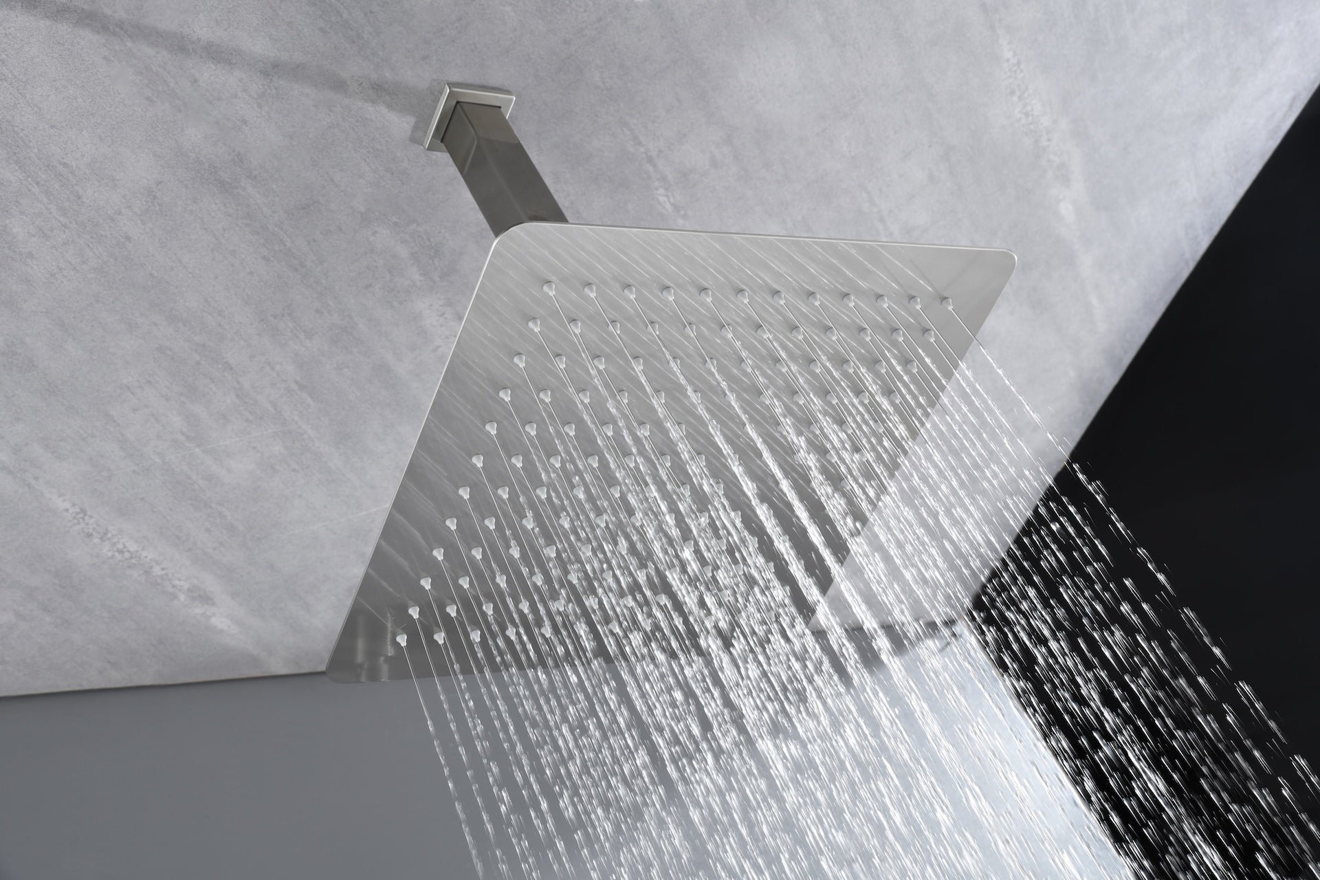 - Choose from two sizes for the top rain head: 12’’ x 12’’ or 16’’ x 16’’ for a luxurious rainfall experience.Upgrade your shower with two styles of shower heads: a classic design without LED lights for a timeless aesthetic, or an LED light-equipped style that creates a mesmerizing shower experience powered by water flow, eliminating the need for batteries. Transform your shower into an oasis of relaxation and ambiance.