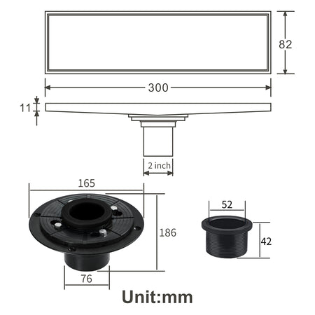The Linear Shower Drain is expertly crafted with precise dimensions of 11.8 inches in length, 3.2 inches in width, and features a central outlet of 2 inches. With a high flow capability of 36 L/min, this drain efficiently channels water away, preventing any water accumulation or unpleasant smells. The base flange is designed to connect seamlessly to the drain pipe, fitting standard U.S. plumbing connections with ease.