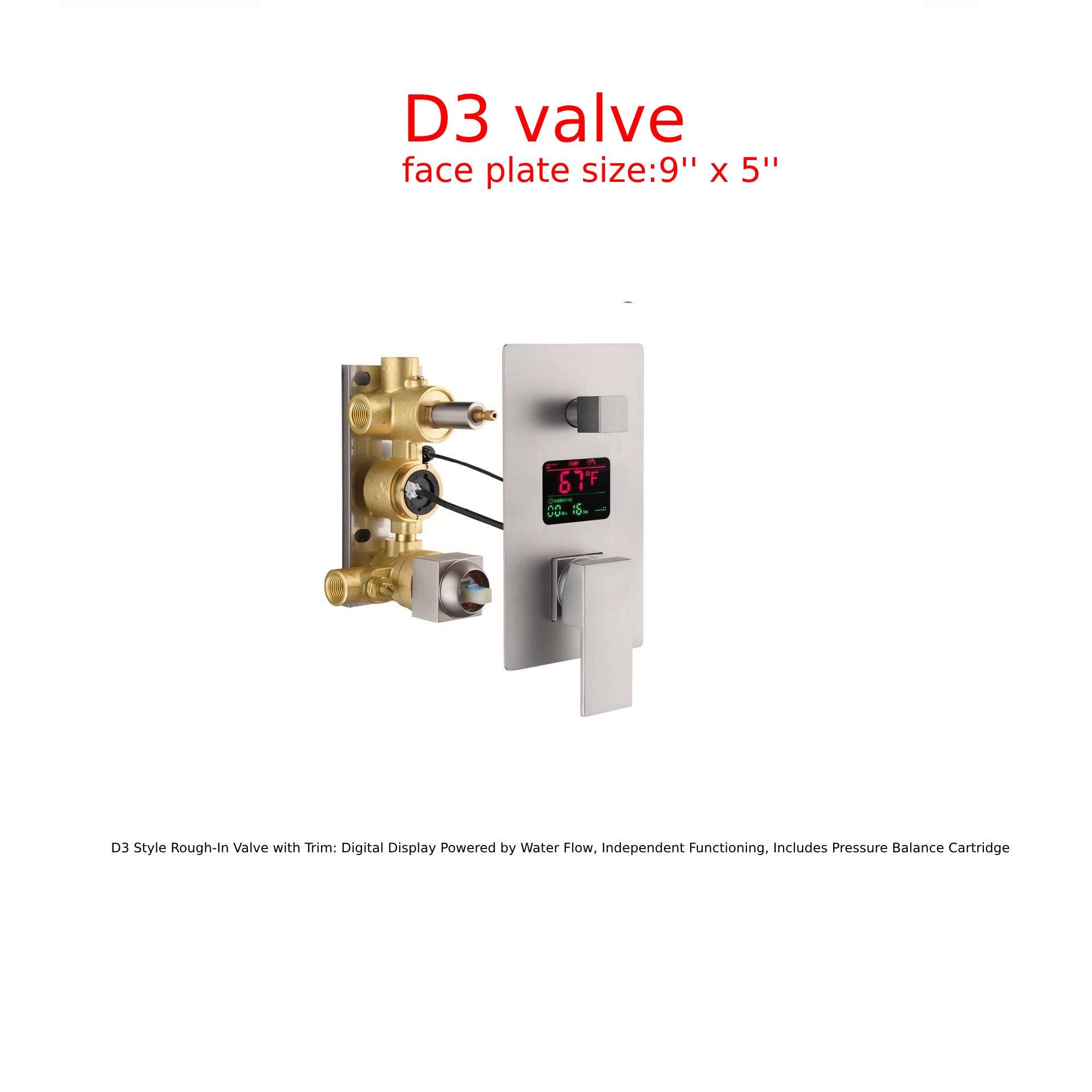 D3 Style Rough-In Valve with Trim: Digital Display Powered by Water Flow, Independent Functioning, Includes Pressure Balance Cartridge.3-Way Rough-In Valve: Features On/Off and Adjustable Water Flow Settings for Enhanced Control.
