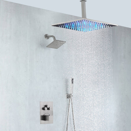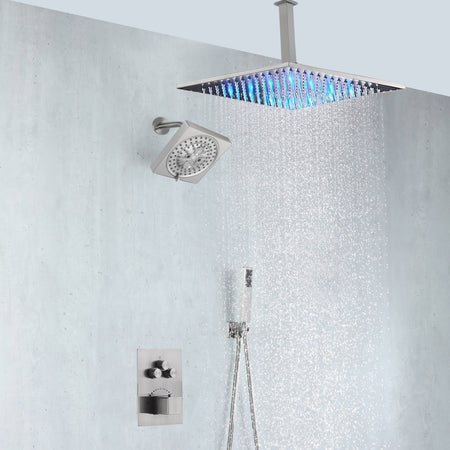 This complete shower system combines functional diversity, high-quality materials, and stylish design. Whether you prefer the gentle, rainfall-like experience of the rain shower head, or the high-pressure, targeted flow of the handheld shower, this system is designed to meet your showering needs. The 3-way thermostatic valve with trim allows for precise control of water temperature, flow, and pressure, while the LED light system in the rain shower head provides a visual indicator of water temperature. All components are crafted from durable, lead-free materials and finished in brushed nickel, ensuring a cohesive aesthetic throughout.