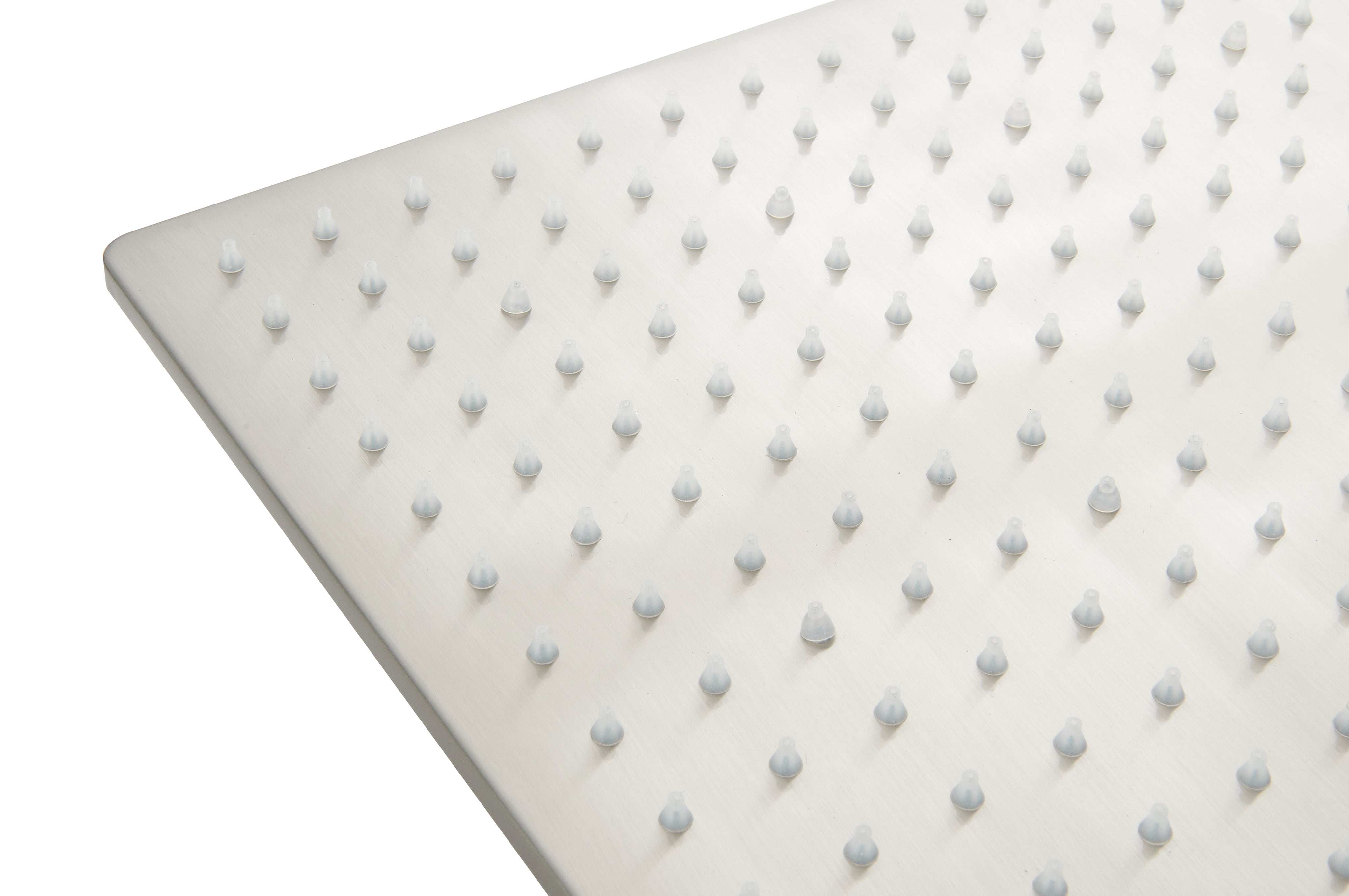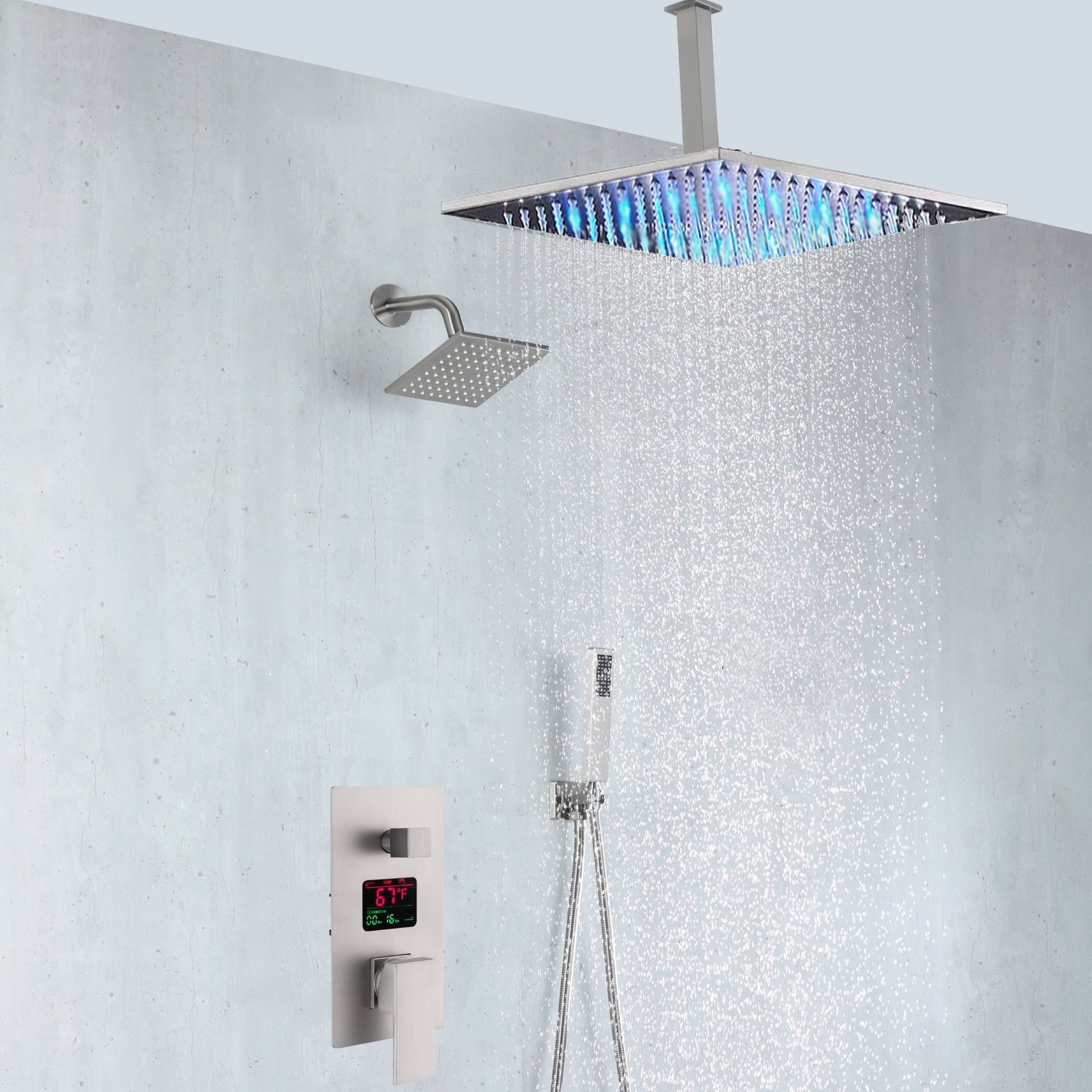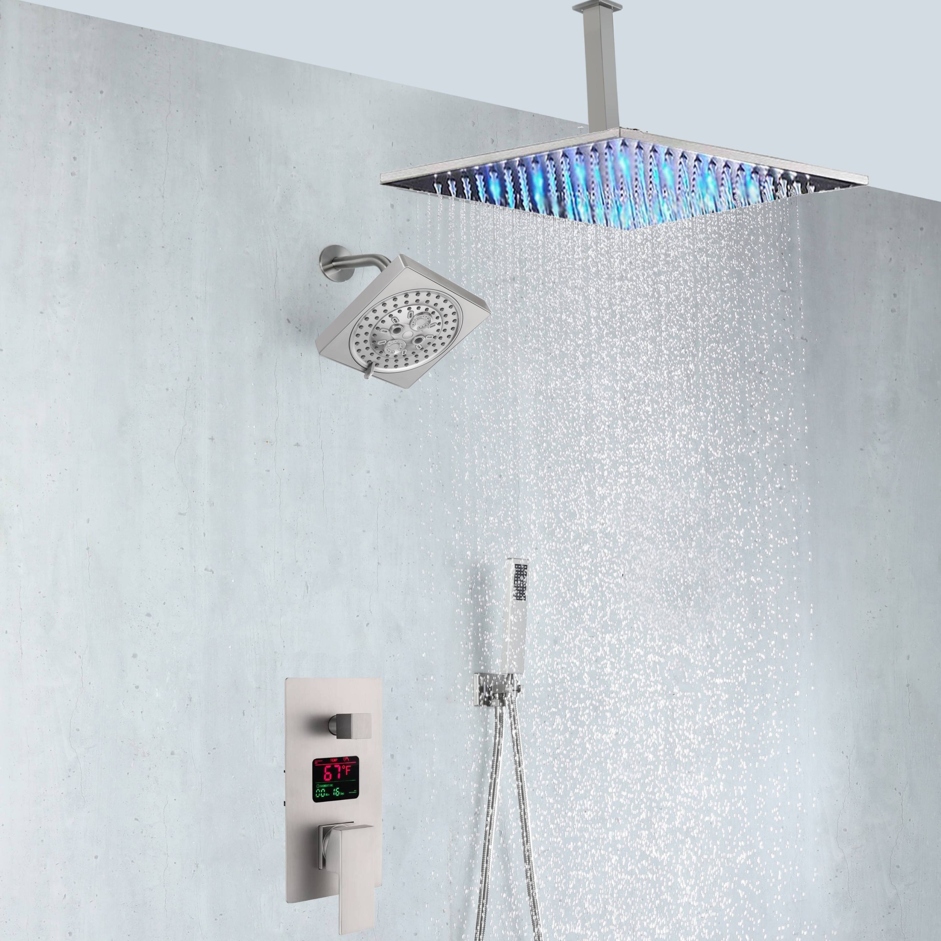 Crafted from stainless steel, this rain shower head provides a luxurious, rainfall-like experience. It is available in both 12" and 16" sizes, and features a LED system powered by water flow that changes color based on the water temperature. The shower head is paired with a 9" ceiling arm, made from durable brass with a brushed nickel finish, ensuring compatibility and a seamless design.