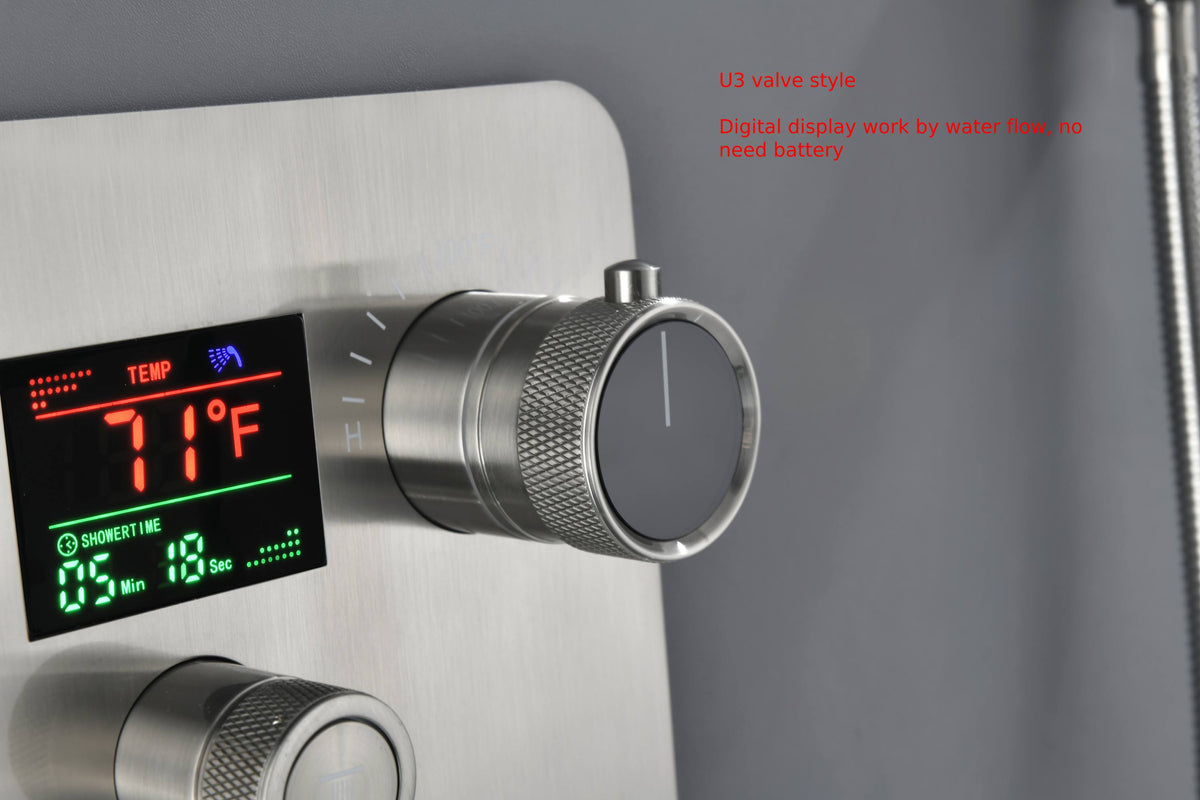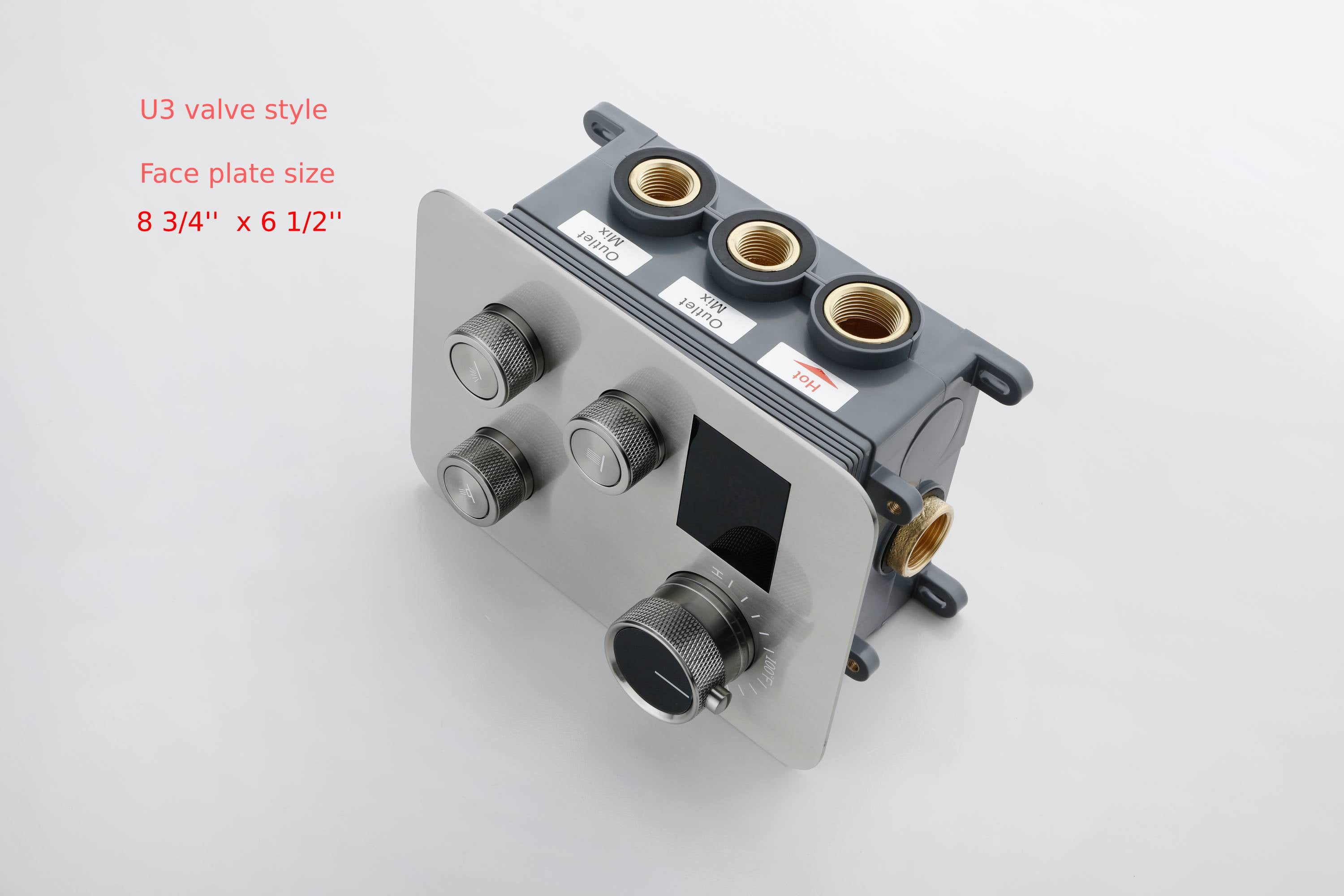 The U3 valve style features a digital display and push buttons for adjusting water flow and pressure, accommodating 1/2 inch or 3/4 inch hot and cold water pipelines, with a high water flow range of 2.5 to 7.8 GPM.