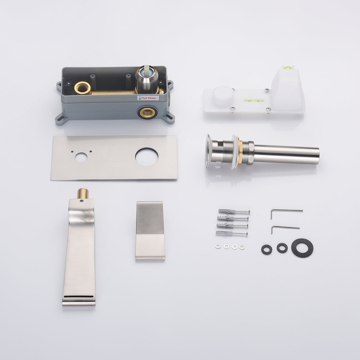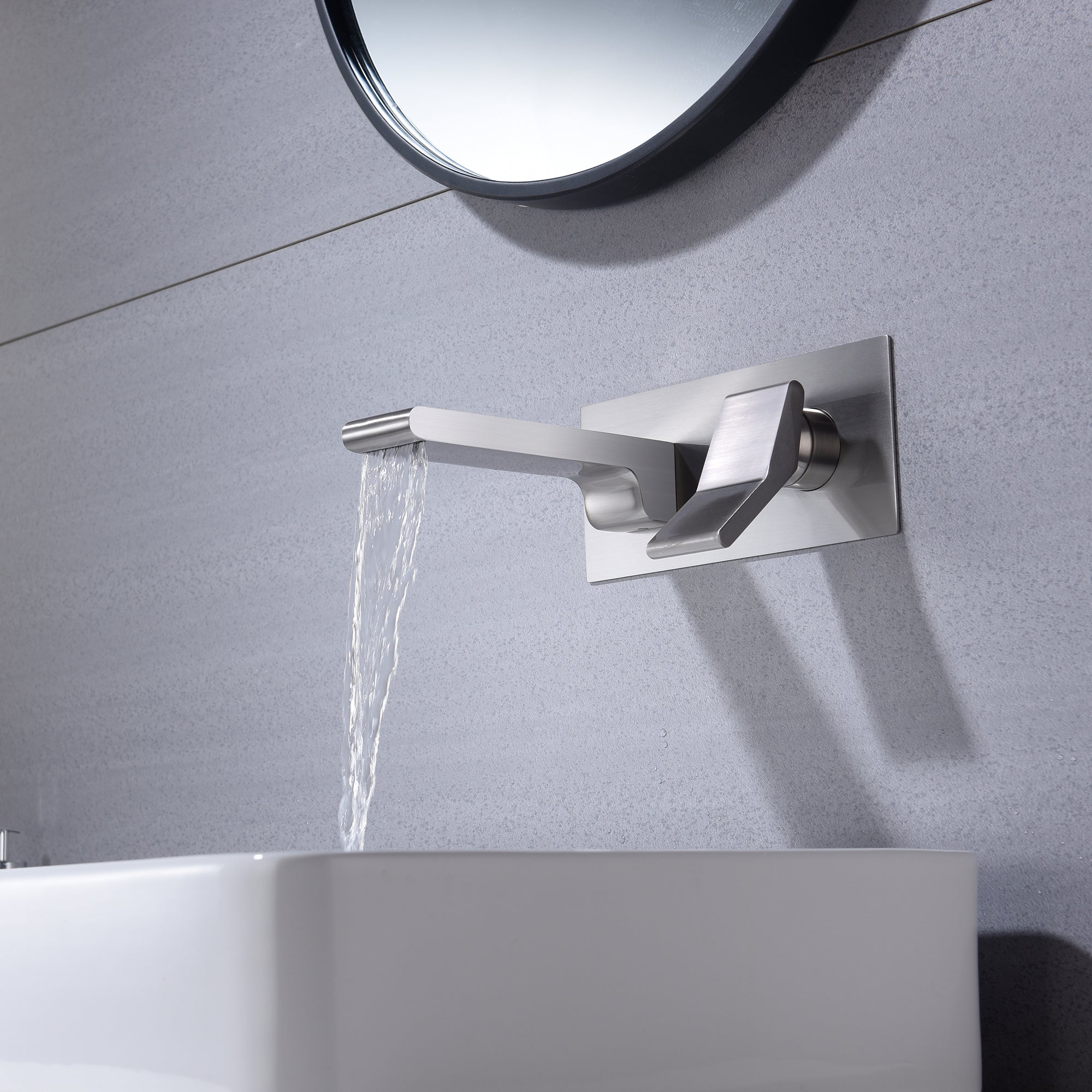 Upgrade your bathroom with our brushed nickel wall-mounted waterfall bathroom faucet. Meticulously designed, this fixture combines functionality, high-quality materials, and a contemporary aesthetic to bring a touch of luxury to your bathroom.