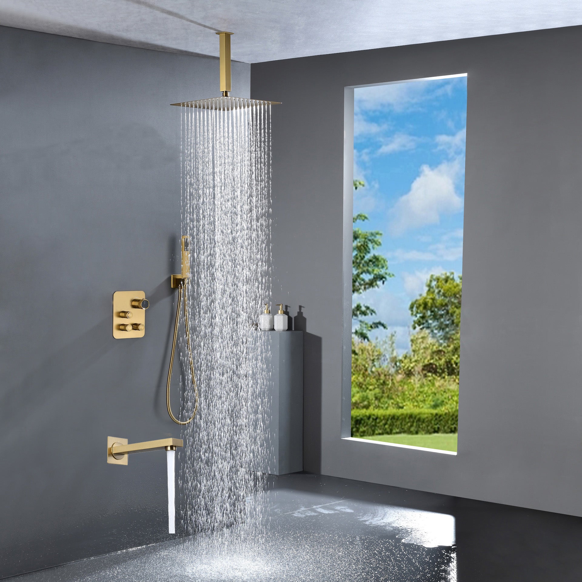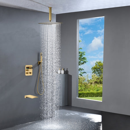 Brushed Gold Ceiling Mount 3-Way Thermostatic Shower Valve System with Waterfall Tub Spout - Simultaneous or Separate Functionality