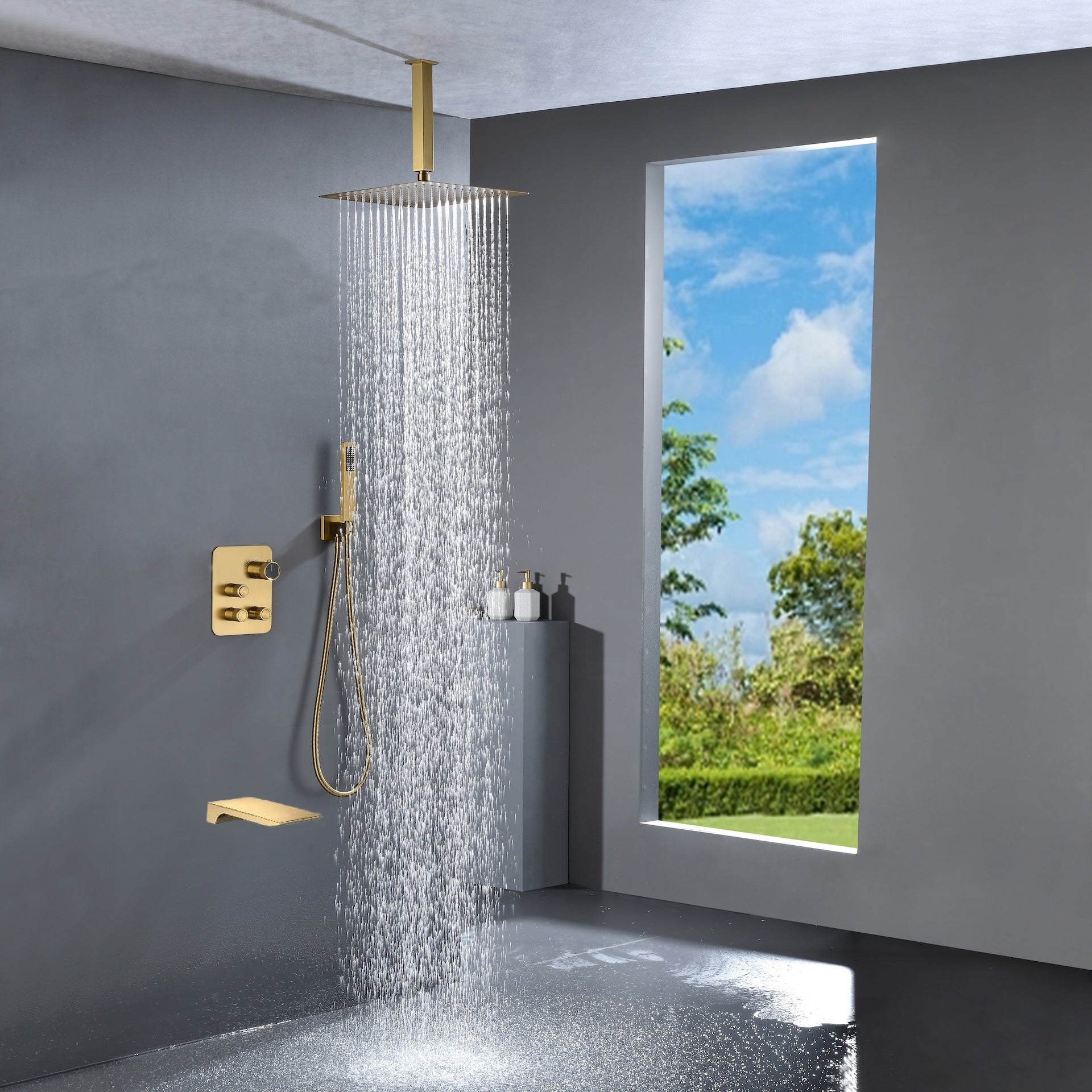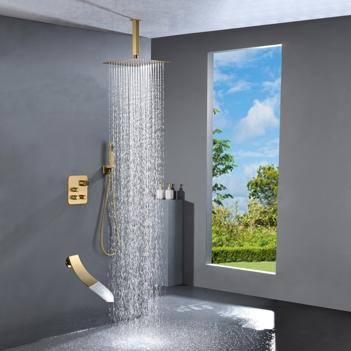 Introducing the Luxurious Brushed Gold Ceiling Mount 3-Way Thermostatic Shower Valve System with Waterfall Tub Spout: