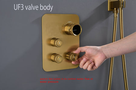 (3) UF3 valve style: without digital display, the push buttons can adjust the water flow and water pressure, it requires 1/2 inch or 3/4 inch hot and cold water pipelines, water flow 2.5~7.8GPM ( high water flow);