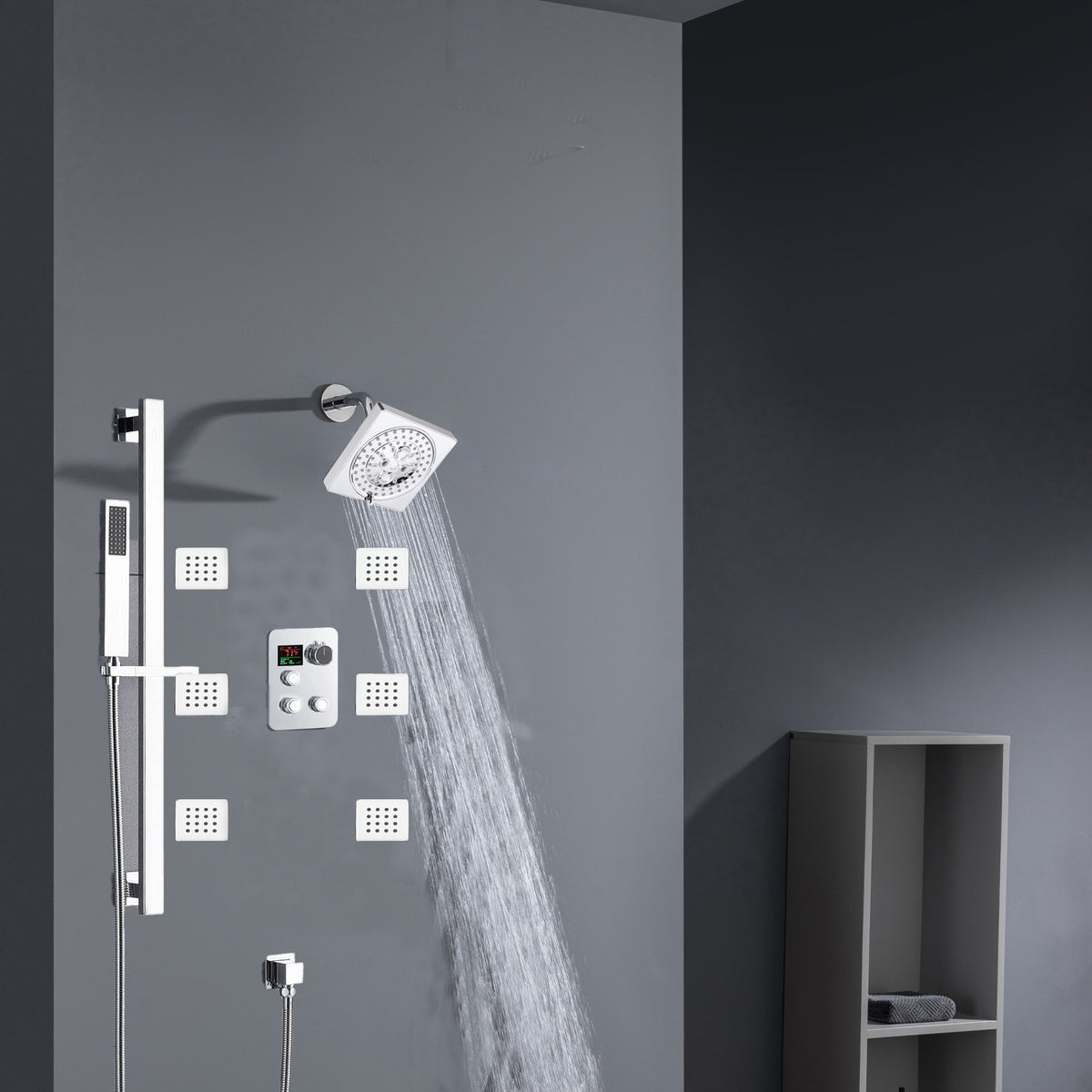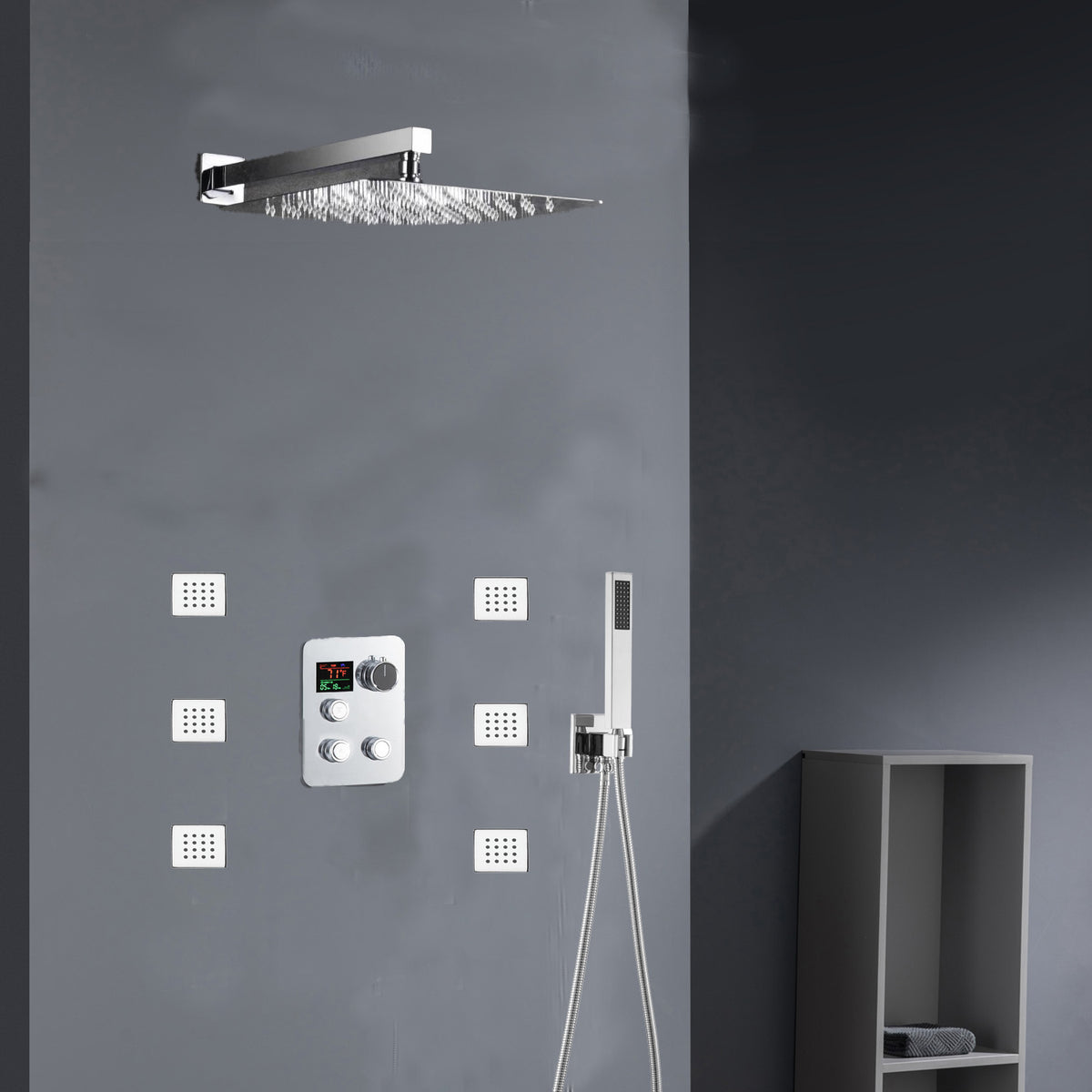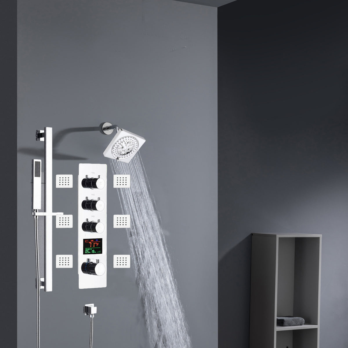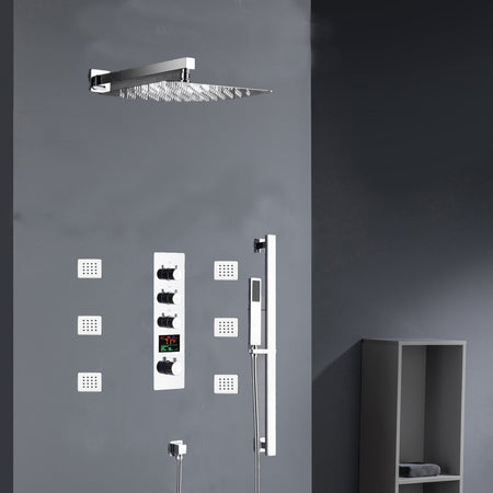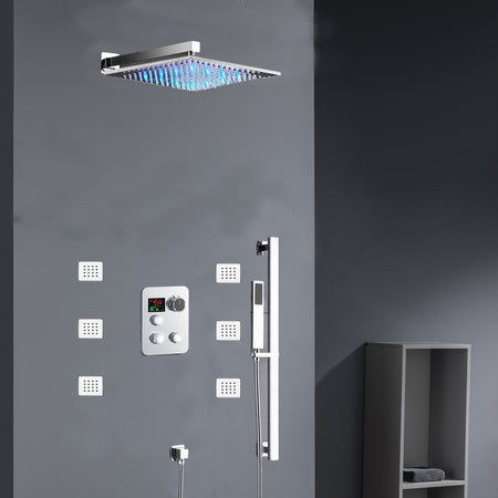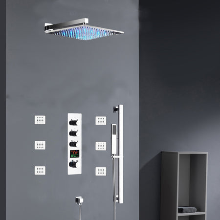 Chrome 12inch LED light or 6 inch regular head Wall mount 3 way thermostatic shower faucet with 6 body jets and sliding bar