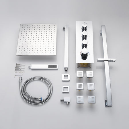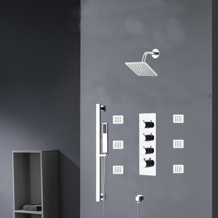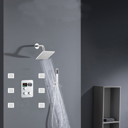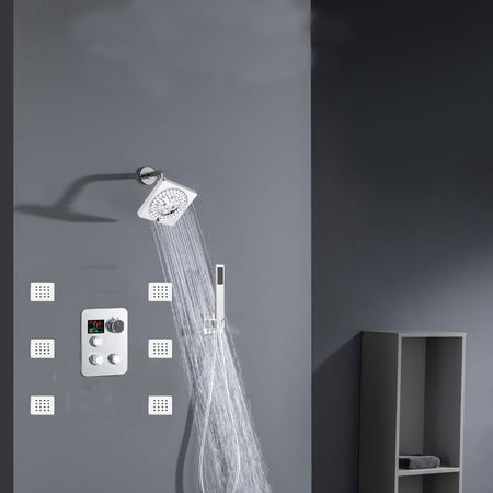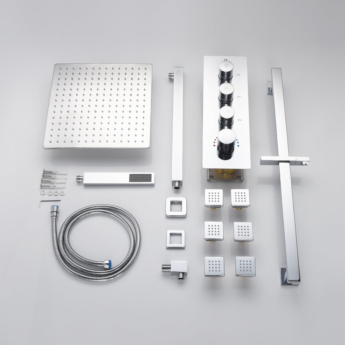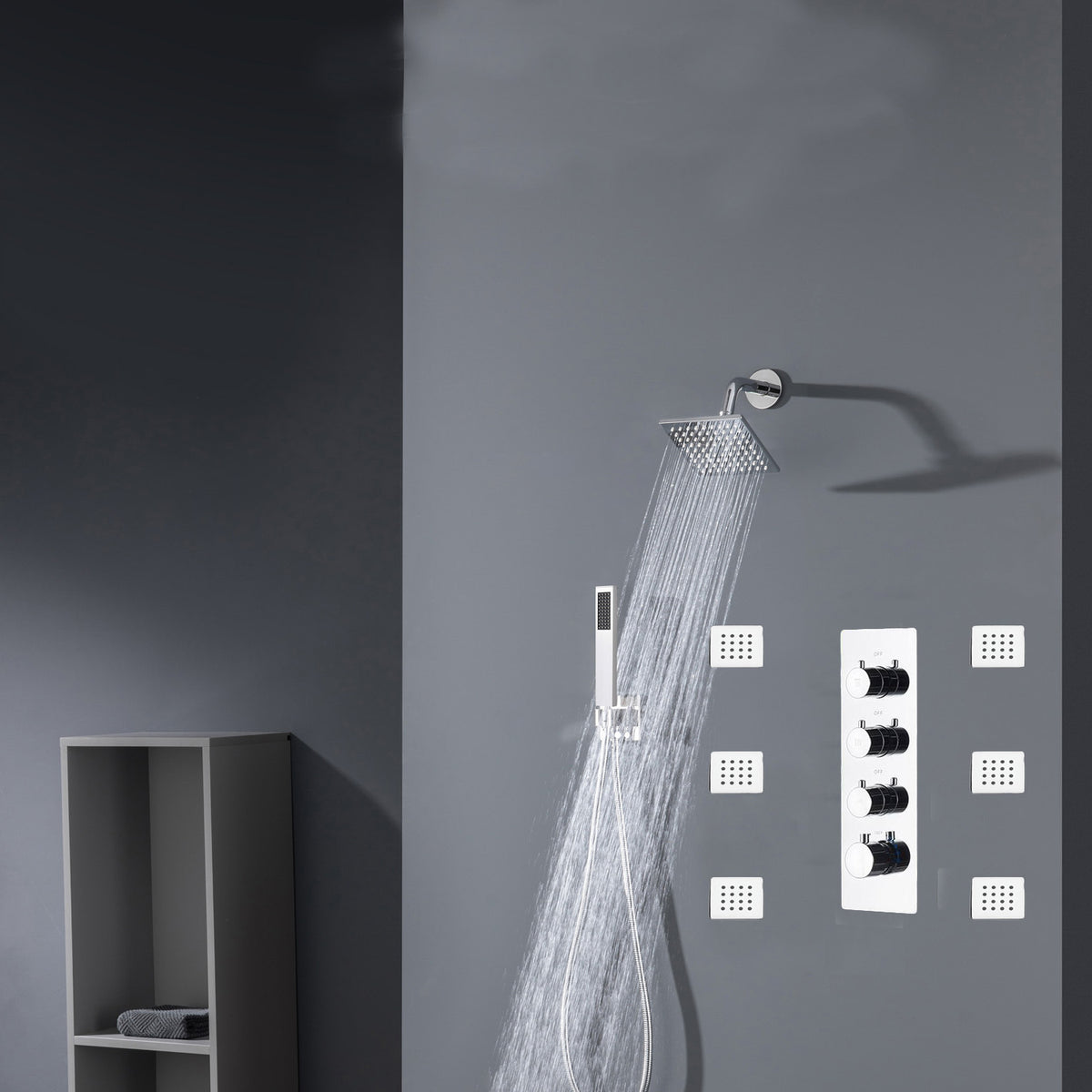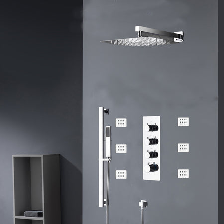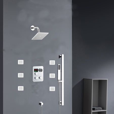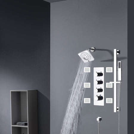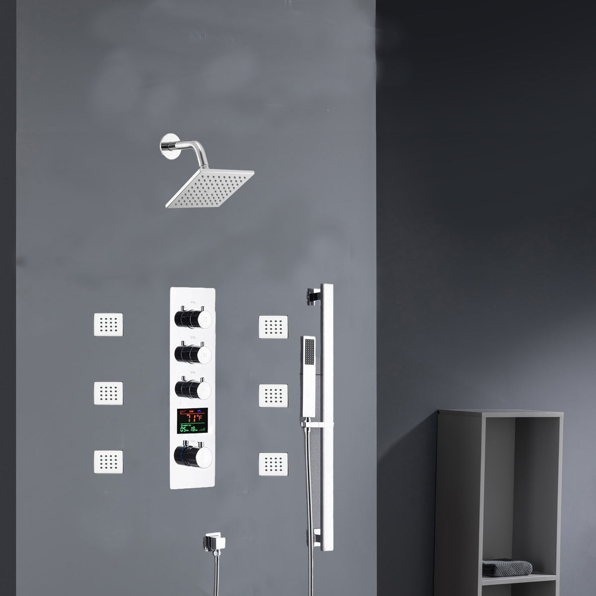 Chrome 12inch LED light or 6 inch regular head Wall mount 3 way thermostatic shower faucet with 6 body jets and sliding bar