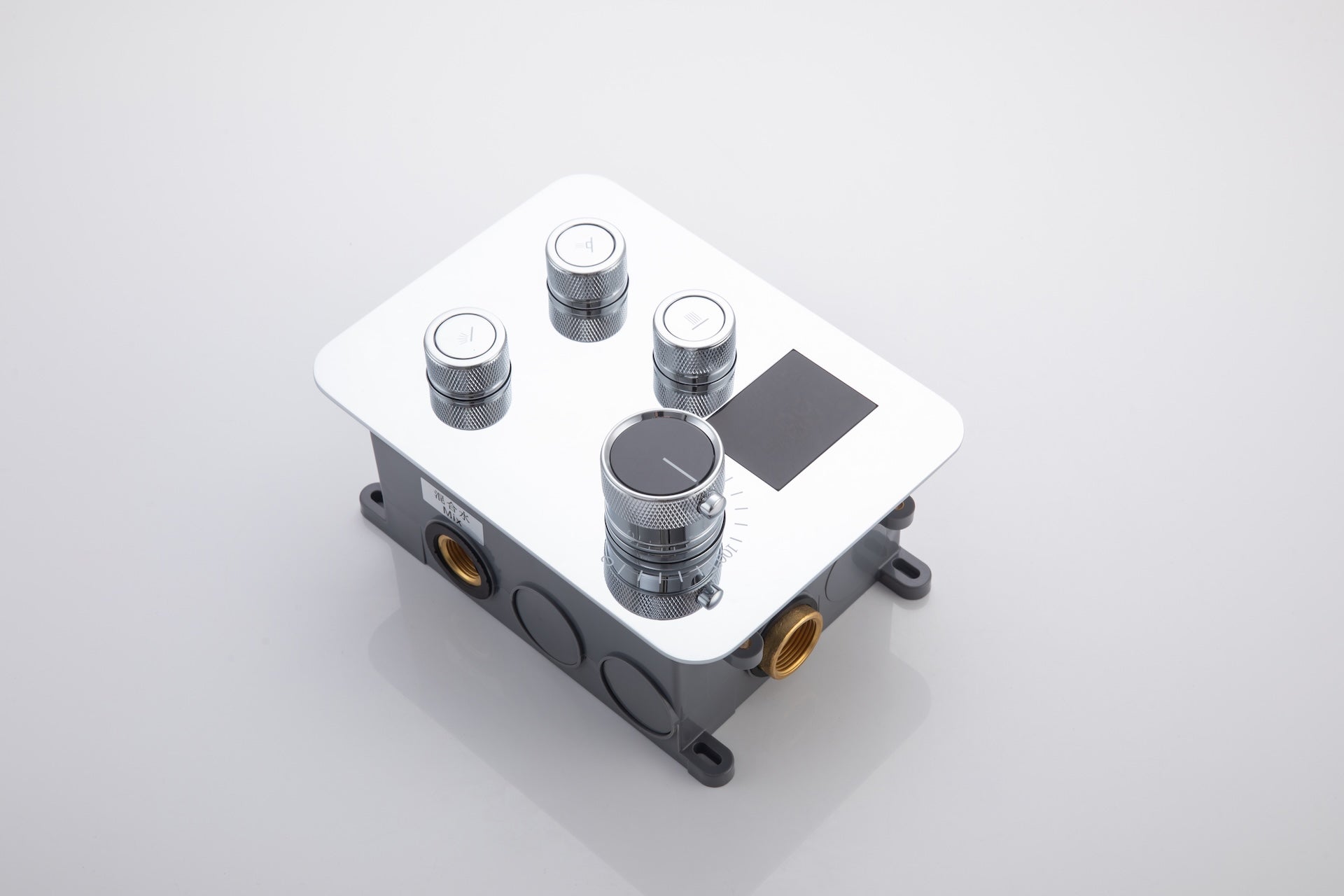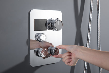 The 3-way thermostatic digital display is made from brass and features a chrome finish. The valve control allows each function to work together or separately. The digital display operates by water flow, eliminating the need for batteries. It includes a three-function thermostatic, anti-scald setting, and adjustable water flow and pressure via knobs.