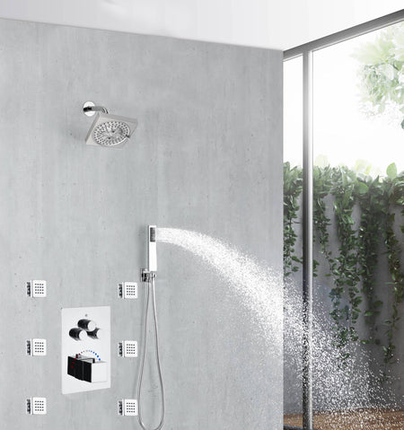 This 3-Way Digital Display Thermostatic Shower System with Body Jets and a 6-inch Regular Head offers a perfect blend of luxury, safety, and state-of-the-art technology, transforming your everyday showering into a spa-like experience.