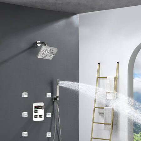 3-Way Digital Display Thermostatic Shower System: Featuring Body Jets and a 6-Inch Regular Head with Independent and Simultaneous Functionality