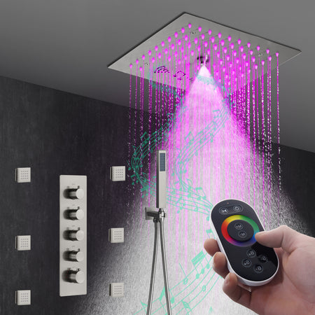 12-Inch Flush-Mount Brushed Nickel Thermostatic Shower Faucet: 4-Way Control, 64-Color LED Lighting, Bluetooth Music, and Body Sprayers